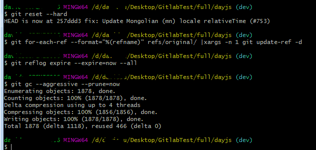 git reset --hardgit for-each-ref --format="%(refname)" refs/original/ |xargs -n 1 git update-ref -dgit reflog expire --expire=now --allgit gc --aggressive --prune=now