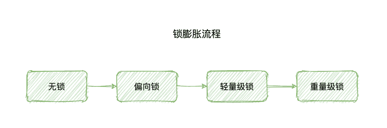 我们先来回顾一下锁膨胀对 synchronized 性能的影响,所谓的锁膨胀是指 synchronized 从无锁更新到偏向锁,再到轻量级锁,最后到重量级锁的过程,它叫做锁膨胀也叫做锁更新。