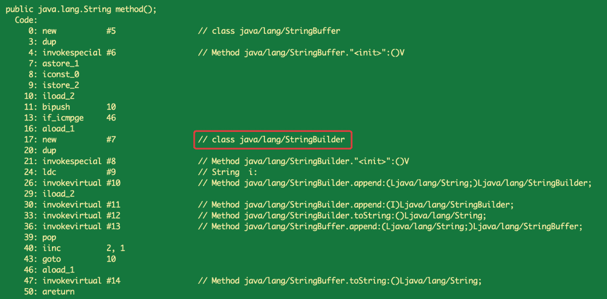 public String method() { StringBuilder sb = new StringBuilder(); for (int i = 0; i < 10; i++) { // 伪代码:加锁操作 sb.append("i:" + i); // 伪代码:解锁操作 } return sb.toString();}