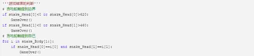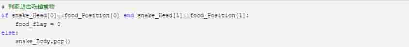 假如蛇头与食物的位置重合,则判定吃到食物,将食物数量清零;而没吃到食物的话,蛇身就会跟着蛇头运动,蛇身的最后一节将被踢出列表。