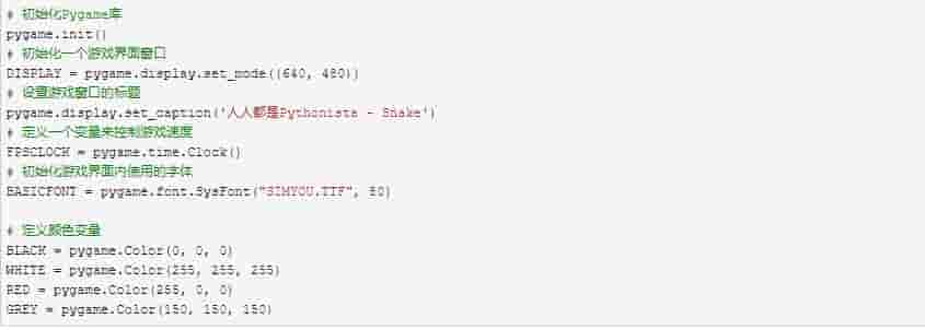 接下来,我们需要公告少量全局参数。如初始化pygame、定义游戏窗口的大小、窗口的标题、定义全局的颜色变量等信息。