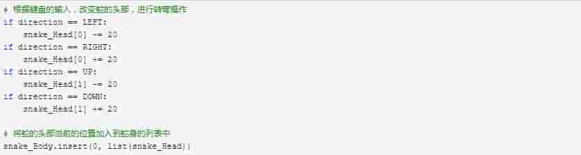 接下来就是将蛇前进方向按照键盘的输入进行转弯操作,并将蛇的头部当前的位置加入到蛇身的列表中。