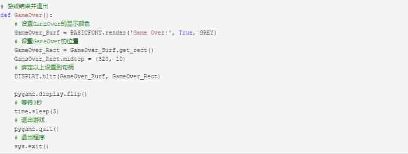 定义函数,用于展现游戏结束的画面并退出程序