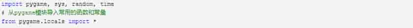 首先导入我们要用到的模块,除了第三方库pygame外,我们还会用到少量Python内置的模块如sys、random、time等,一并导入就可。