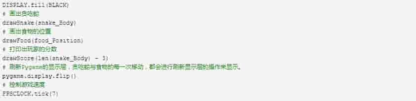 这些都定义好之后,我们需要在游戏主逻辑中调用它们,并刷新Pygame的显示层,贪吃蛇与食物的每一次移动,都会进行刷新显示层的操作来显示。最后我们可以设定一个速度值来正当控制游戏执行的速度。