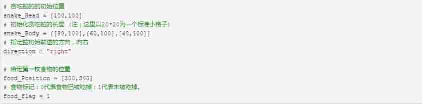 游戏中需要有贪吃蛇及食物,我们给定一个初始值。我们将整个界面看成许多20*20的小方块,每个小方块代表一个标准小格子,贪吃蛇的长度即可以用几个标准小格子表示。我们将贪吃蛇身体用列表的形式存储,方便之后的删减。