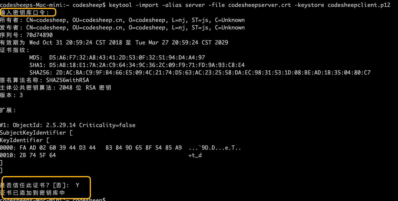 keytool -export -alias server -file codesheepserver.crt --keystore codesheepserver.p12 会要求你输入密码