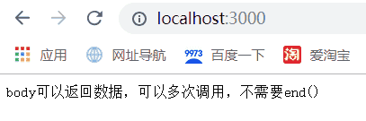 `const Koa = require(``"koa"``);``const koa =` `new` `Koa();``koa.use(async (ctx, next)=>{``ctx.body =` `"body可以返回数据,"``;``ctx.body +=` `"可以屡次调用,"``;``ctx.body +=` `"不需要end()"``;``});``koa.listen(3000, ()=>{``console.log(``"监听开始"``);``});`