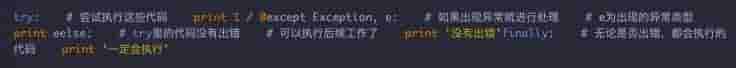Python代码中可能会出现少量可以预知的问题,例如字典访问的key不存在。假如不加解决,发生问题的时候Python便会报错并退出,可能之前跑了很久又要重头再来。因而,我们需要对可能出现的异常进行捕捉和解决。异常的结构由 try 、 except 、 else 、 finally 四部分组成。