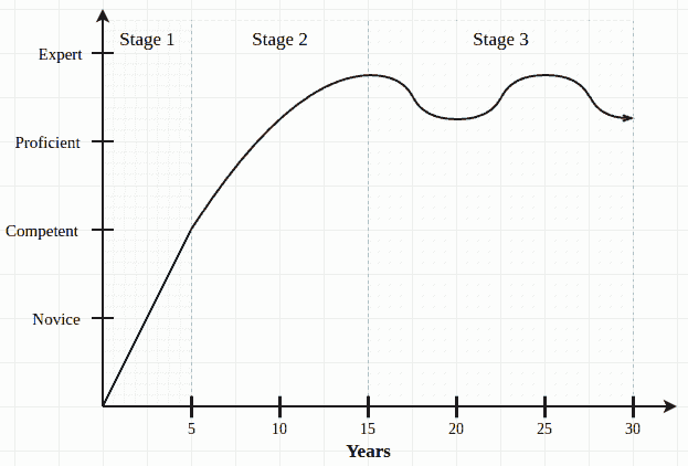 我正处于第三阶段。我还是很喜欢学习,但我明白,不努力的话,我可能会一直保持在“专家”的平衡状态边缘。