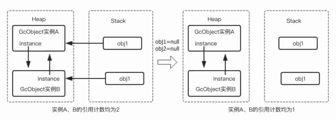 仔细阅读代码中的注释,并结合下面的内存结构示用意,应该可以很好的了解其中的起因:假如JVM垃圾收集器采用引用计数法,当obj1和obj2不再指向堆中的实例A、B时,尽管A、B已经不可能再被访问,但彼此间相互引用导致计数器的值不为0,最终导致无法回收A和B。