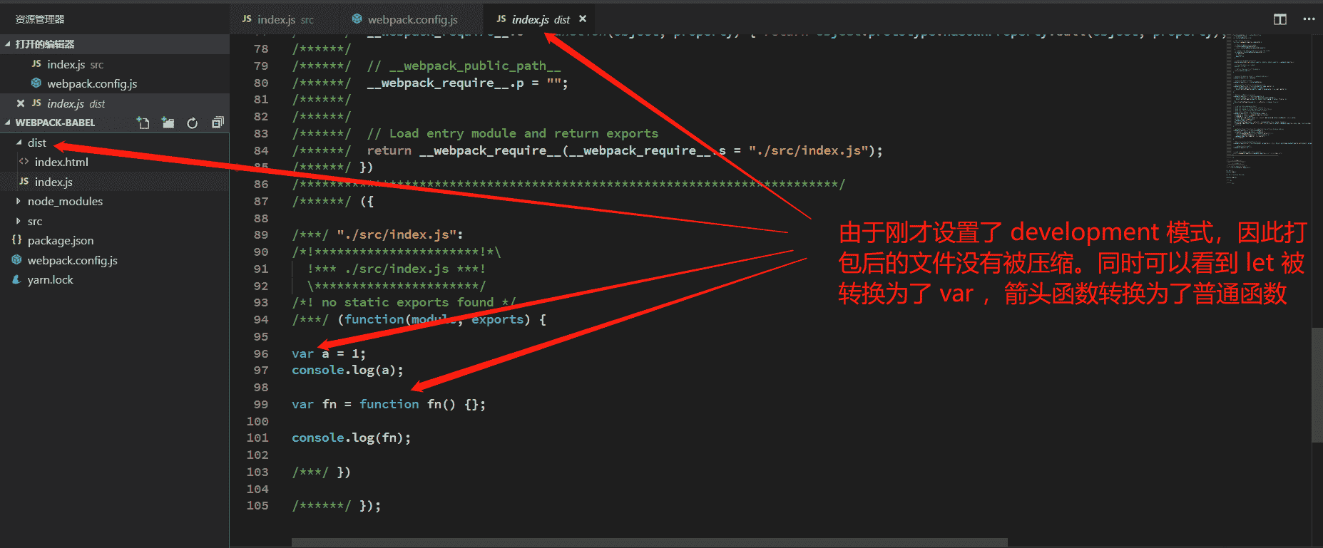 webpack.config.js,chrome 60 版本已经支持 let 和 箭头函数,打包后代码 不应该 再被转换。browsers: ["chrome >= 60"]yarn build