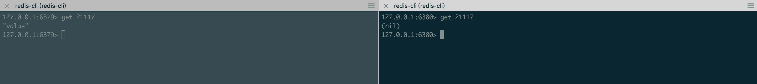 不妨进行一次尝试,比方在6379设置key 1 2,而到6380 get 1只能得到nil,说明它们是各自工作的,已经满足可以测试的条件。