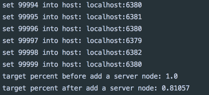 部署4个节点,从6379到6382,通过一致性Hash算法,将key: 0~99999共100000个key分别set到这4个服务器上,而后再部署一个节点6383,这时再从0到99999开始get一遍,统计get到的次数来验证命中率能否为期望的80%(4/5)。
