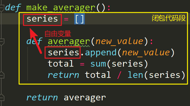 黄色区域表示产生闭包现象的代码段。其中的 series 数组是自由变量(free variable),不受内部函数 averager 的影响,所以可以保存所有传入的变量值。