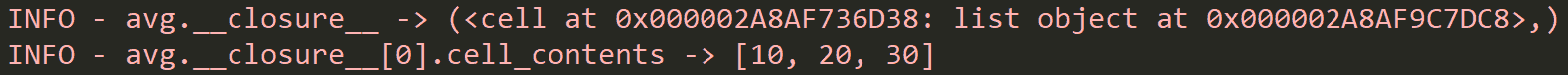 INFO - avg.__closure__ -> (<cell at 0x000002A8AF736D38: list object at 0x000002A8AF9C7DC8>,)INFO - avg.__closure__[0].cell_contents -> [10, 20, 30]