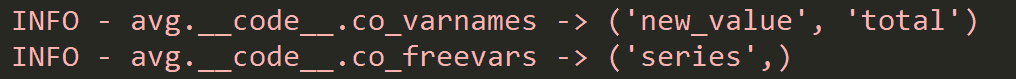 logging.info('avg.__code__.co_varnames -> %s', avg.__code__.co_varnames)logging.info('avg.__code__.co_freevars -> %s', avg.__code__.co_freevars)