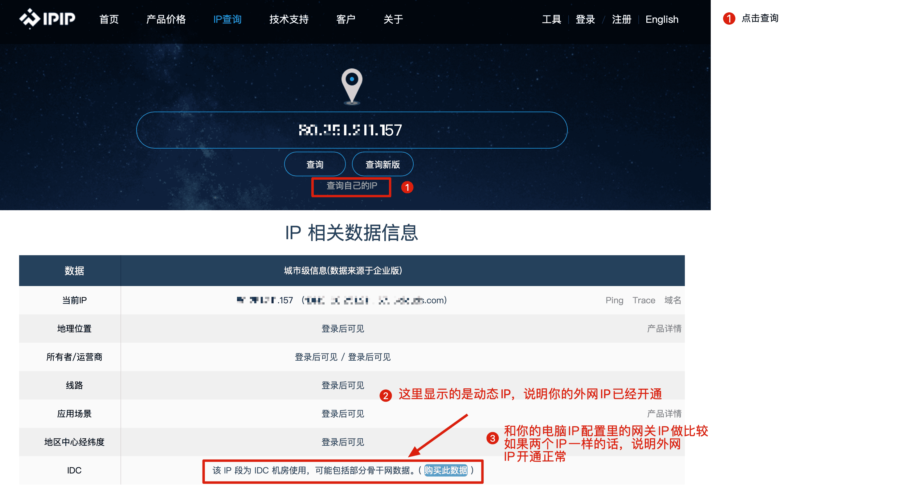 如何查看自己的IP是不是外网IP呢,办法是,在www.ipip.net查询一下,假如显示是动态IP,再拿这个IP和你的电脑的IP配置里的默认网关的IP比较下,假如一致就说明这个动态IP申请成功了。
