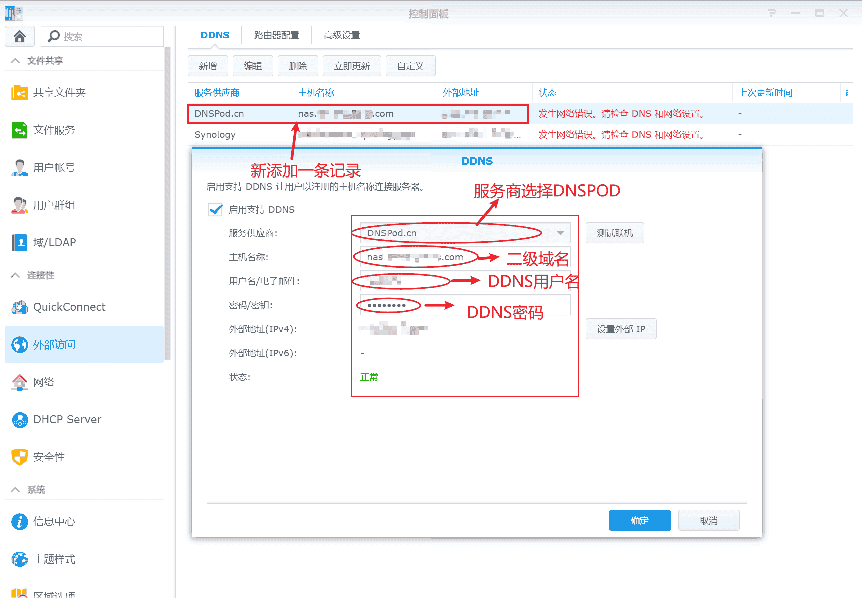 不同路由器厂商对DNS服务商的支持程度不一样,华为Q2的路由器不支持DNSPOD提供的域名,所以配置DDNS我只能另辟蹊径,通过群辉NAS来实现DDNS。