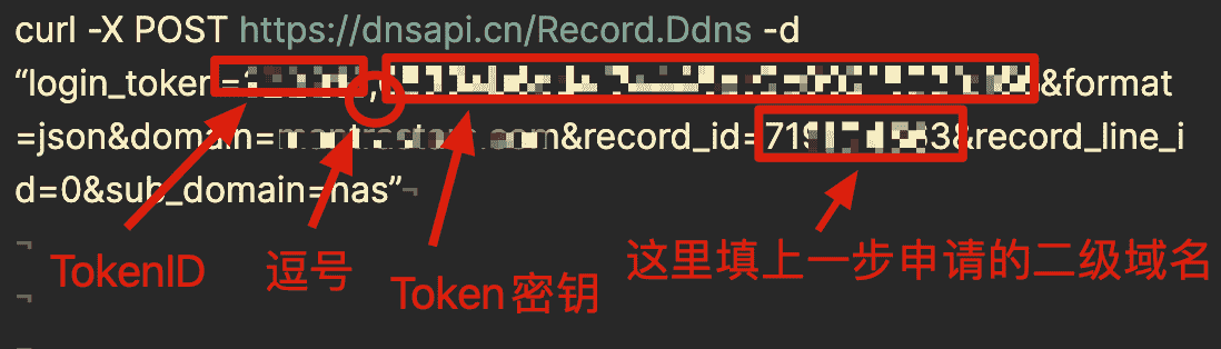 curl -X POST https://dnsapi.cn/Record.Ddns -d “login_token=XXXX,XXXXXXXXXXXXXXXX&format=json&domain=mysite.com&record_id=71XXX3&record_line_id=0&sub_domain=nas”