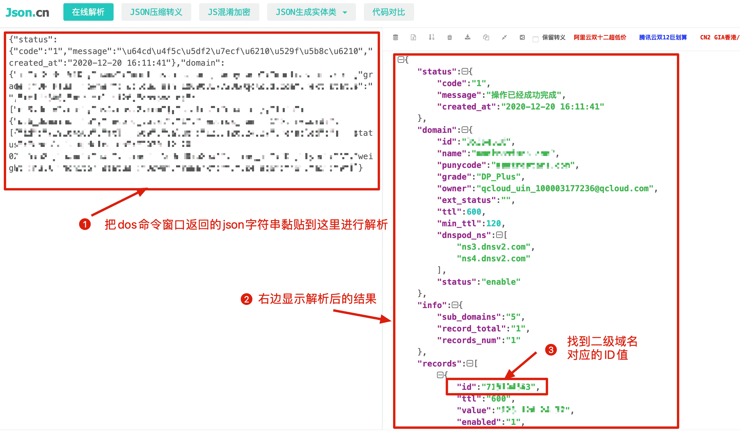 返回的结果,需要解析一下,把返回的json数据,在https://www.json.cn网站进行在线解析,找到nas二级域名对应的ID为:71XXX3。