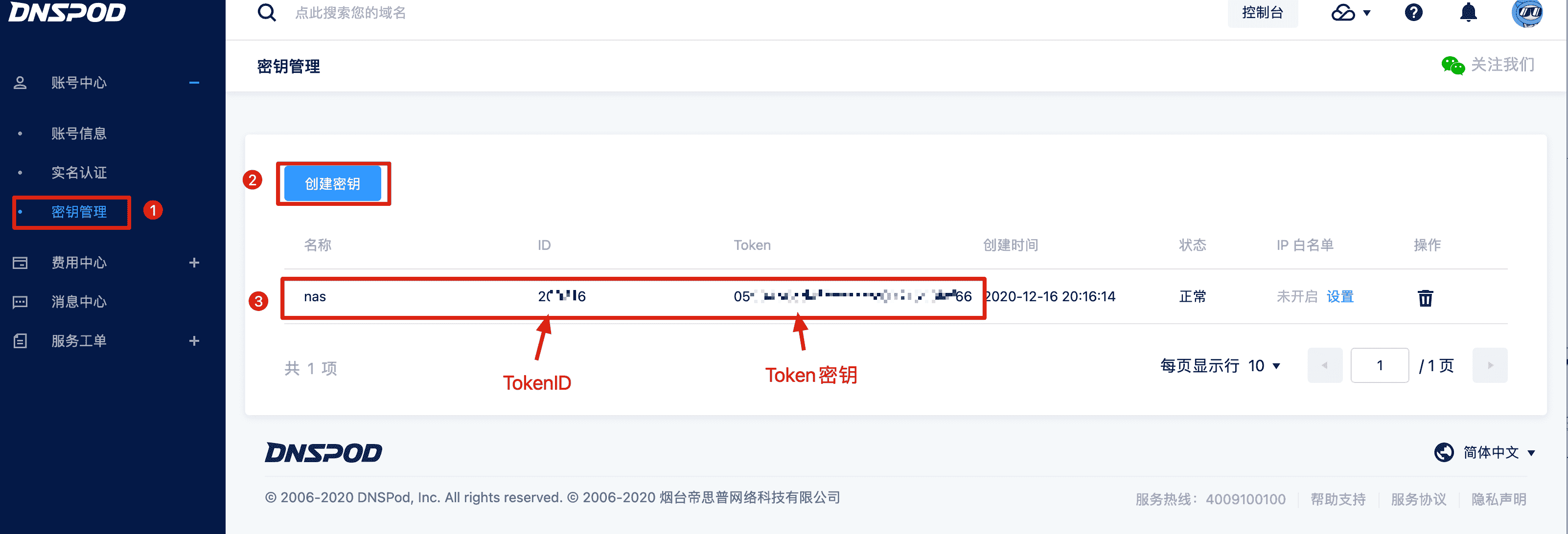 DDNS的Token和密钥申请先在DNSPOD的账号管理中心的密钥管理里申请一对TokenID和Token密钥,而后在使用dos控制台(win10是在运行窗口里输入:cmd打开控制台),输入如下指令: