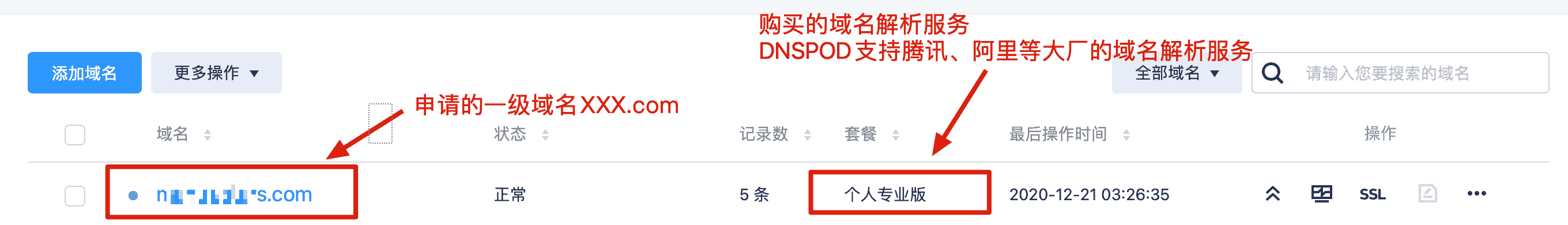 (1)申请域名。这个很常见,有很多域名服务商提供域名,建议花钱购买一个属于自己的域名,也不算贵,一般的域名价格每年几块到几十块不等,后缀都是少量不常用的。假如要一个常用后缀的域名,大概要每年70-90块钱。我在DNSPOD上申请了一个“.com”后缀的域名,一年70块钱。一般域名购买还是买少量大厂的域名要可靠少量,主要是后续的在线支持,遇到问题,大厂的技术支撑要给力的多。这次我买的域名和域名解析都是腾讯云提供的,客服小姐姐很热心,半夜问问题都有耐心的回复。实在搞不定的,还可以QQ远程支持帮忙搞定。比方我申请的一级域名是mysite.com。