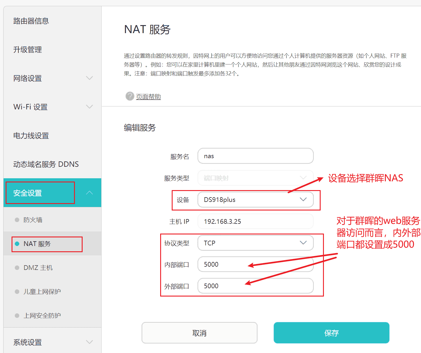 以NAS远程访问为例,需要内外部打开5000端口,所以添加一条NAT端口映射记录: