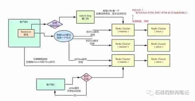 咱们来看上面那张图,现在某个用户端要加锁。假如该用户端面对的是一个redis cluster集群,他首先会根据hash节点选择一台机器。