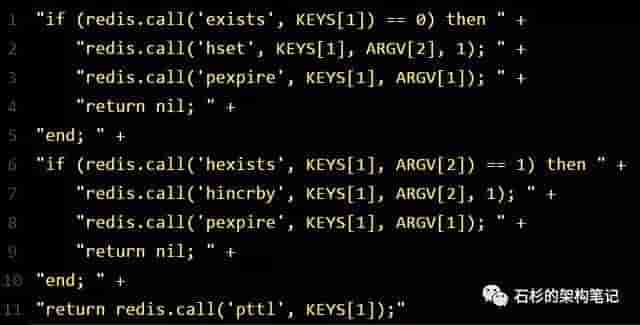 紧接着,就会发送一段lua脚本到redis上,那段lua脚本如下所示: