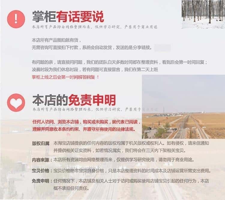 宝贝价格:宝贝价格纯属卖家定价,仅是本店整理资料的时间成本及店铺运营所须支付费用。
