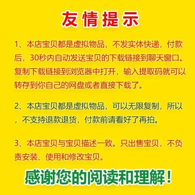 2、本店宝贝都是虚拟物品,可以无限复制,所以不支持退款退货,付款前请看好了再拍。