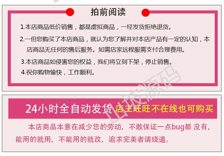 本店商品本意在减少您的劳动,不敢保证一点bug都没有,能用的就用,不能用的就改,追求完美者请绕道。