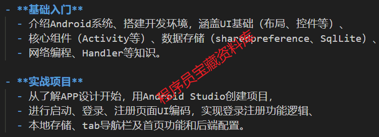 - 介绍Android系统、搭建开发环境,涵盖UI基础(布局、控件等)、核心组件(Activity等)、数据存储(sharepreference、SqlLite)、网络编程、Handler等知识。