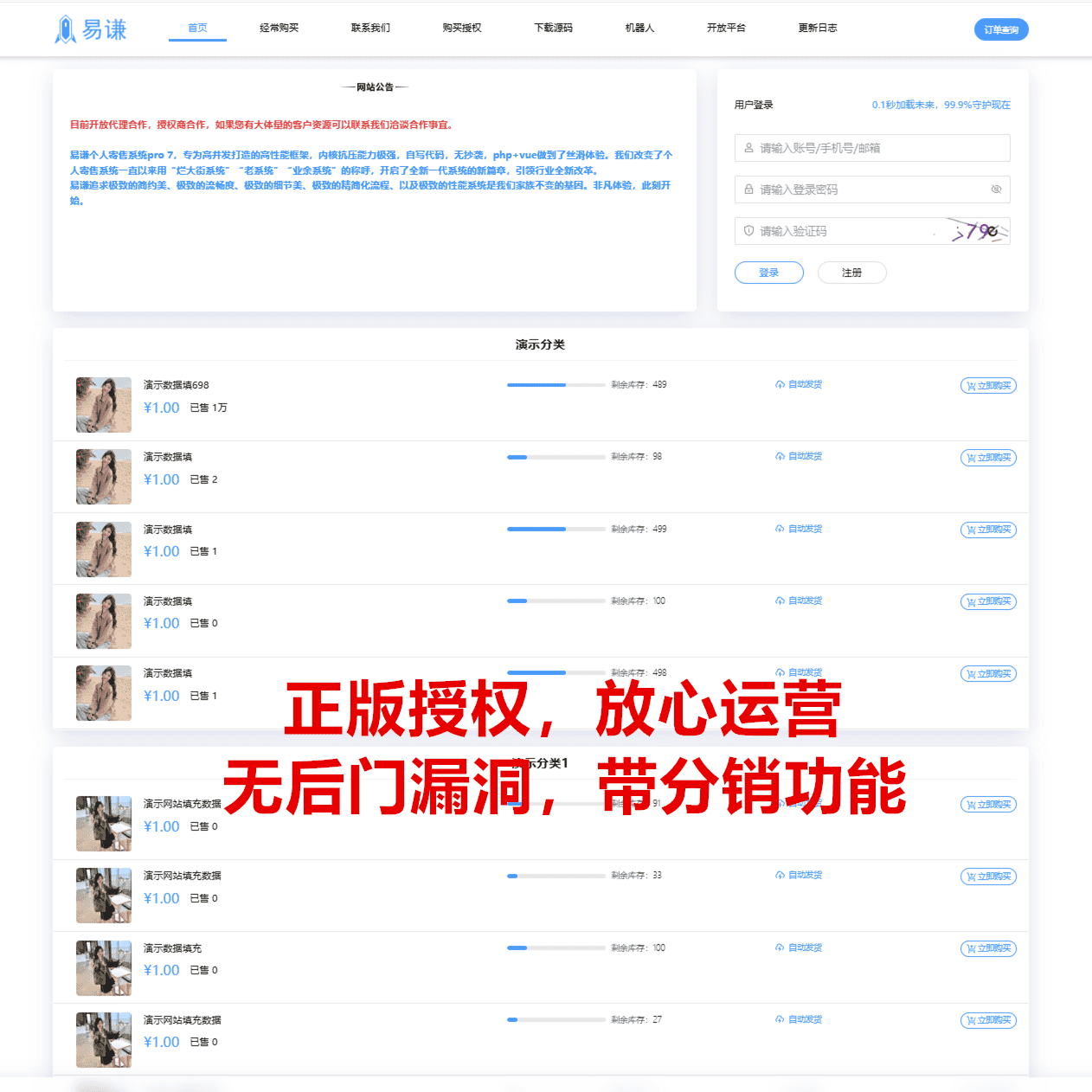 易谦个人寄售系统pro 5,专为高并发打造的高性能框架,内核抗压能力极强,自写代码,无抄袭,php vue做到了丝滑体验。我们改变了个人寄售系统一直以来用“烂大街系统”“老系统”“业余系统”的称呼,开启了全新一代系统的新篇章,引领行业全新改革。