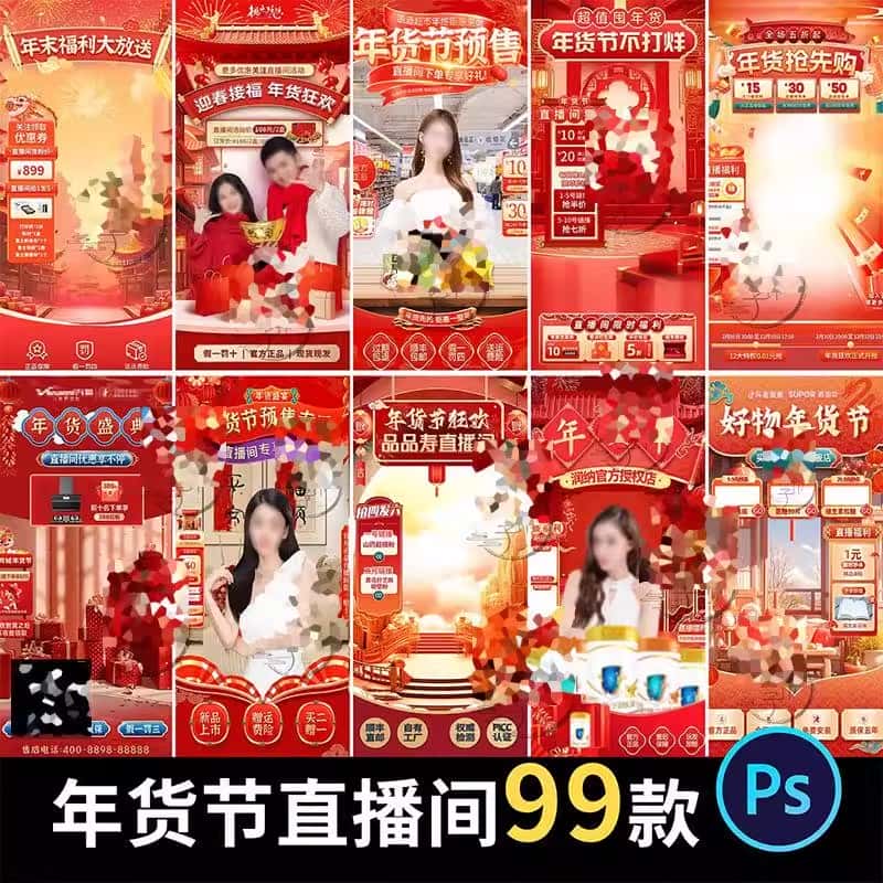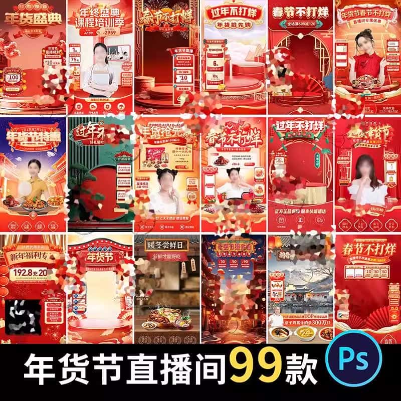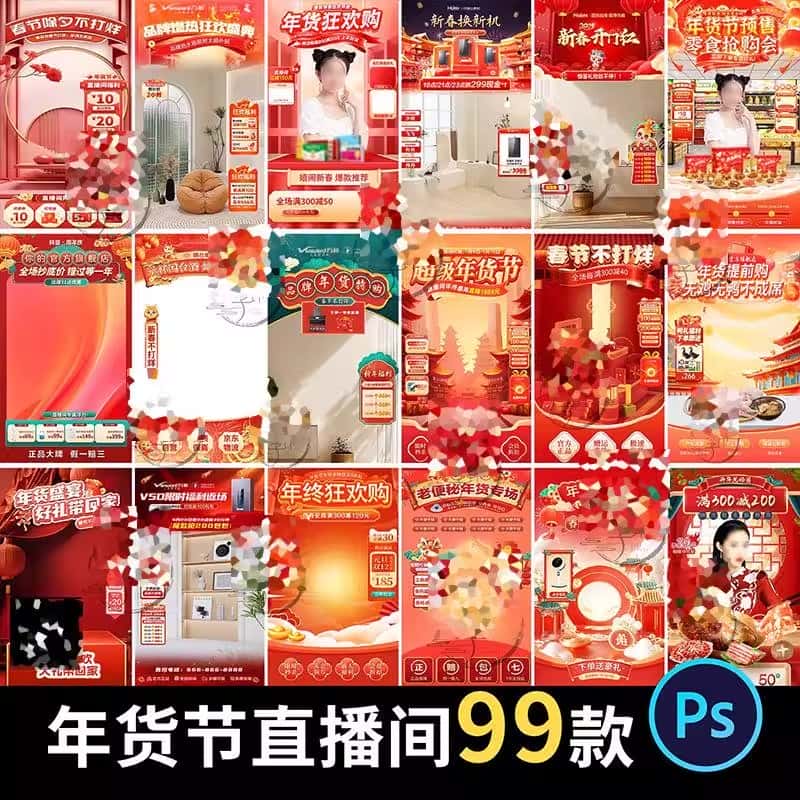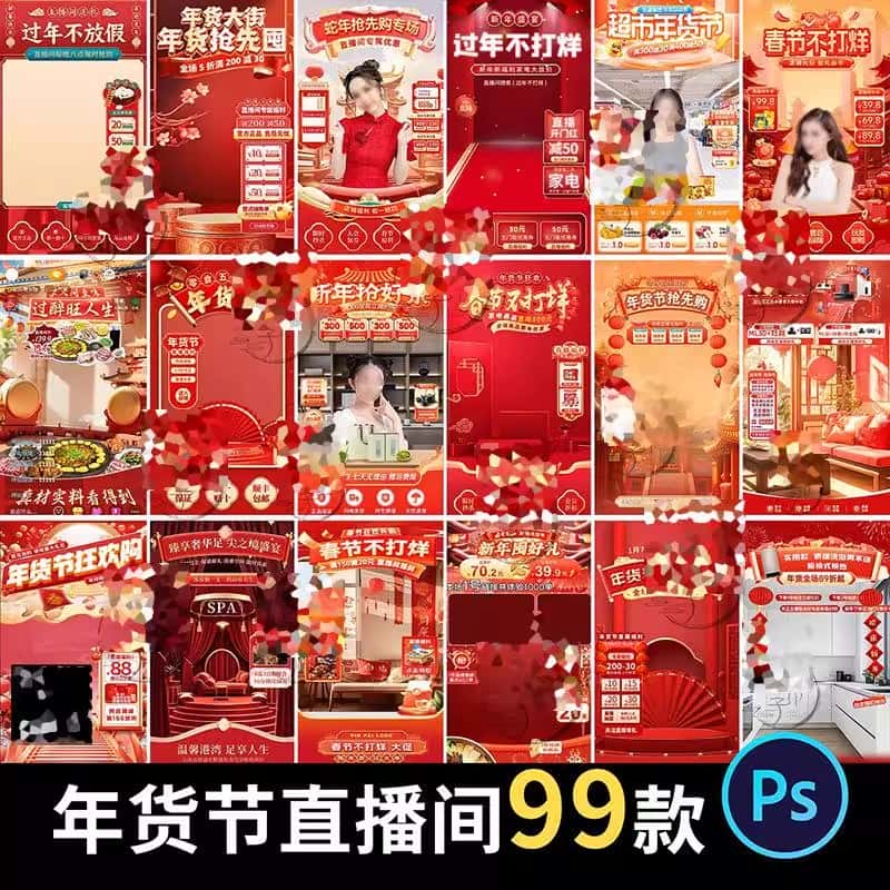 电商抖音年货节新年春节直播间虚拟绿幕背景图贴片PS设计素材模板