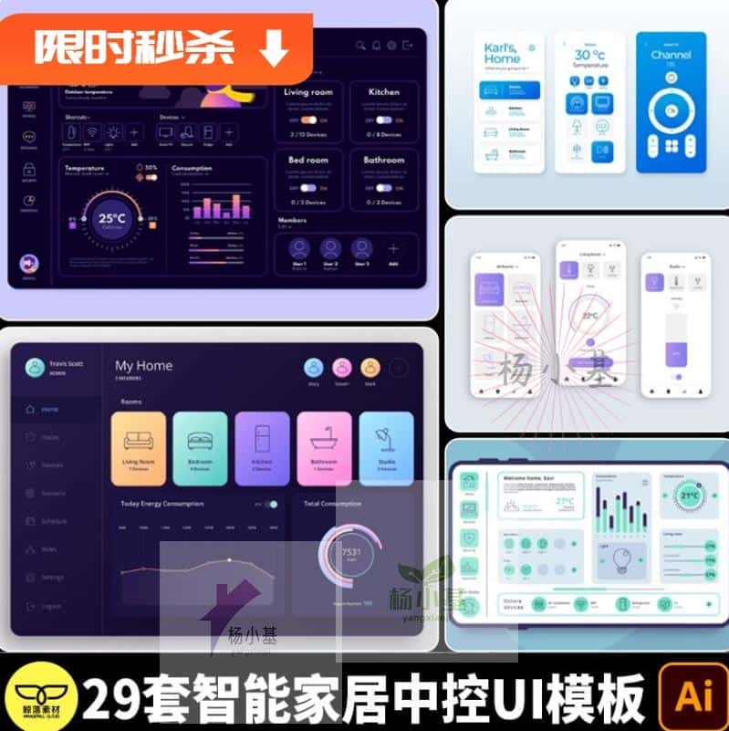 智能家居温度灯光音量中控手机APP控制面板图标界面UI设计AI素材
