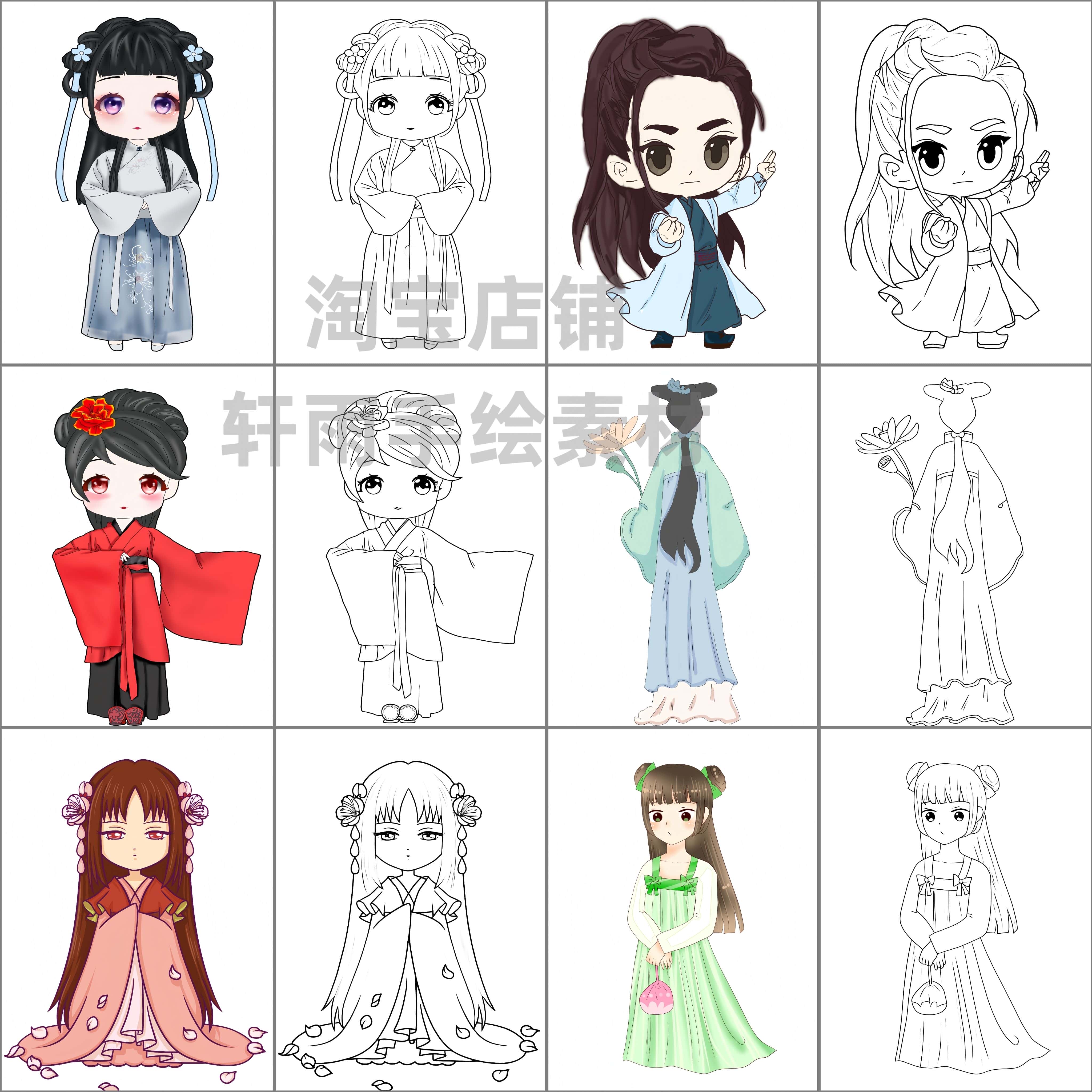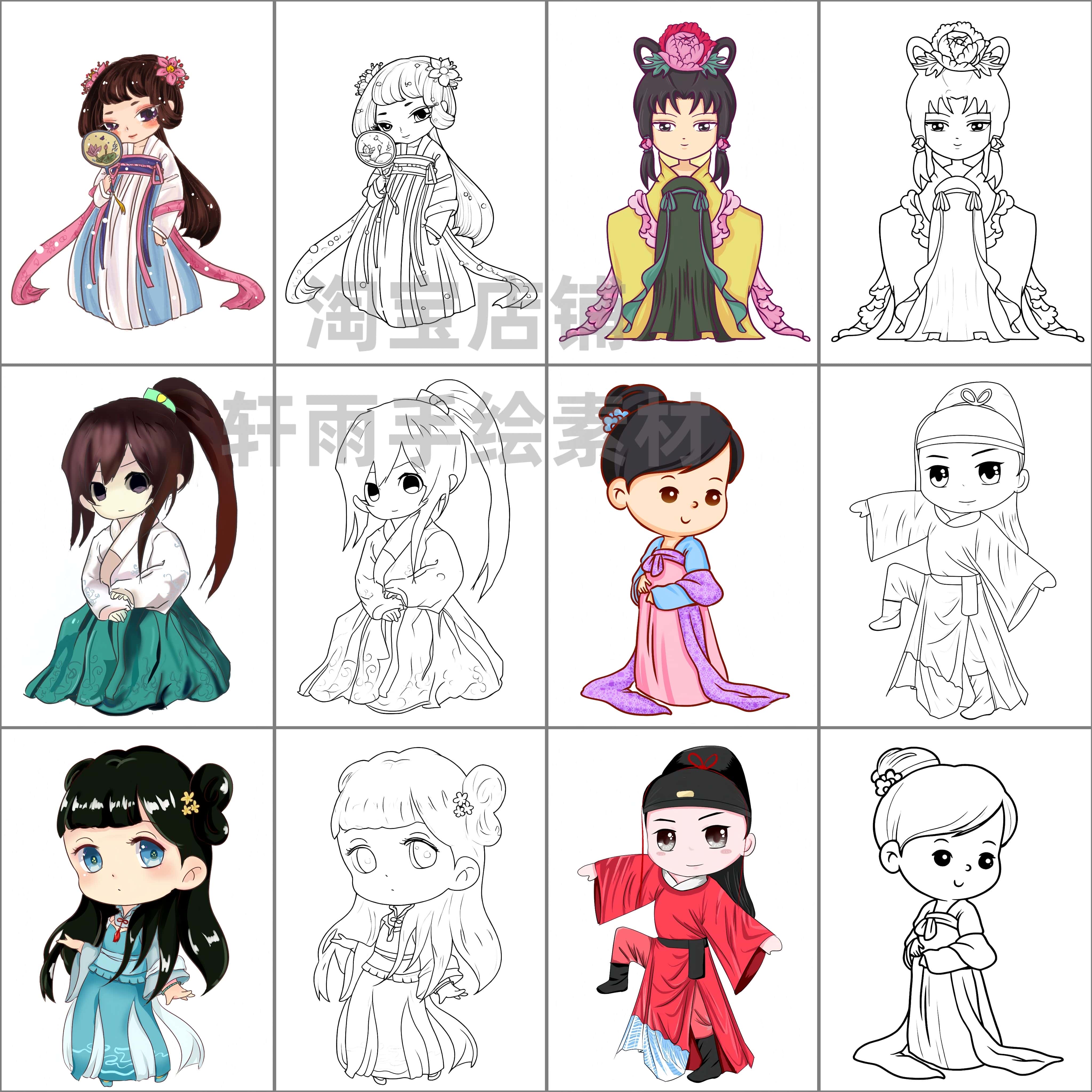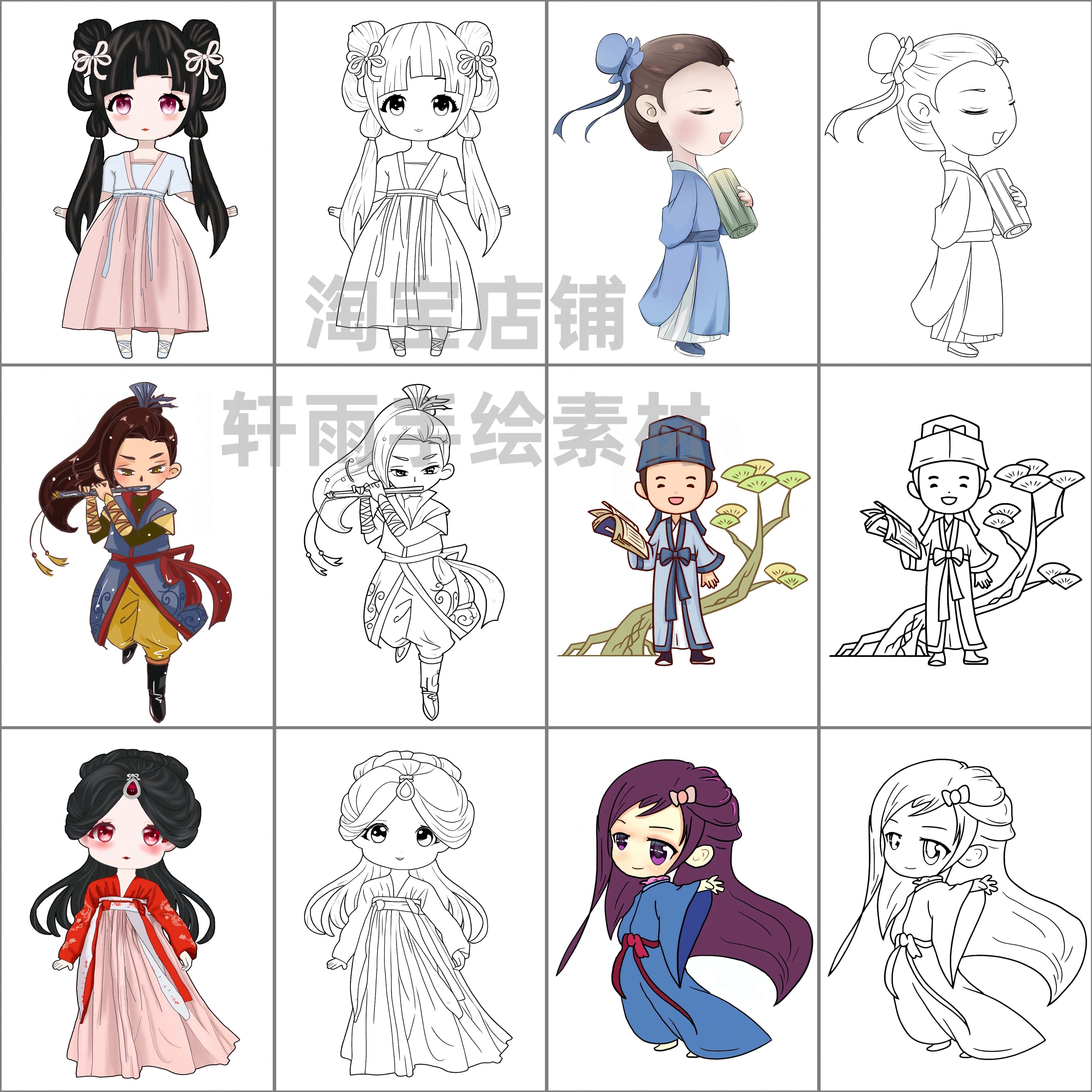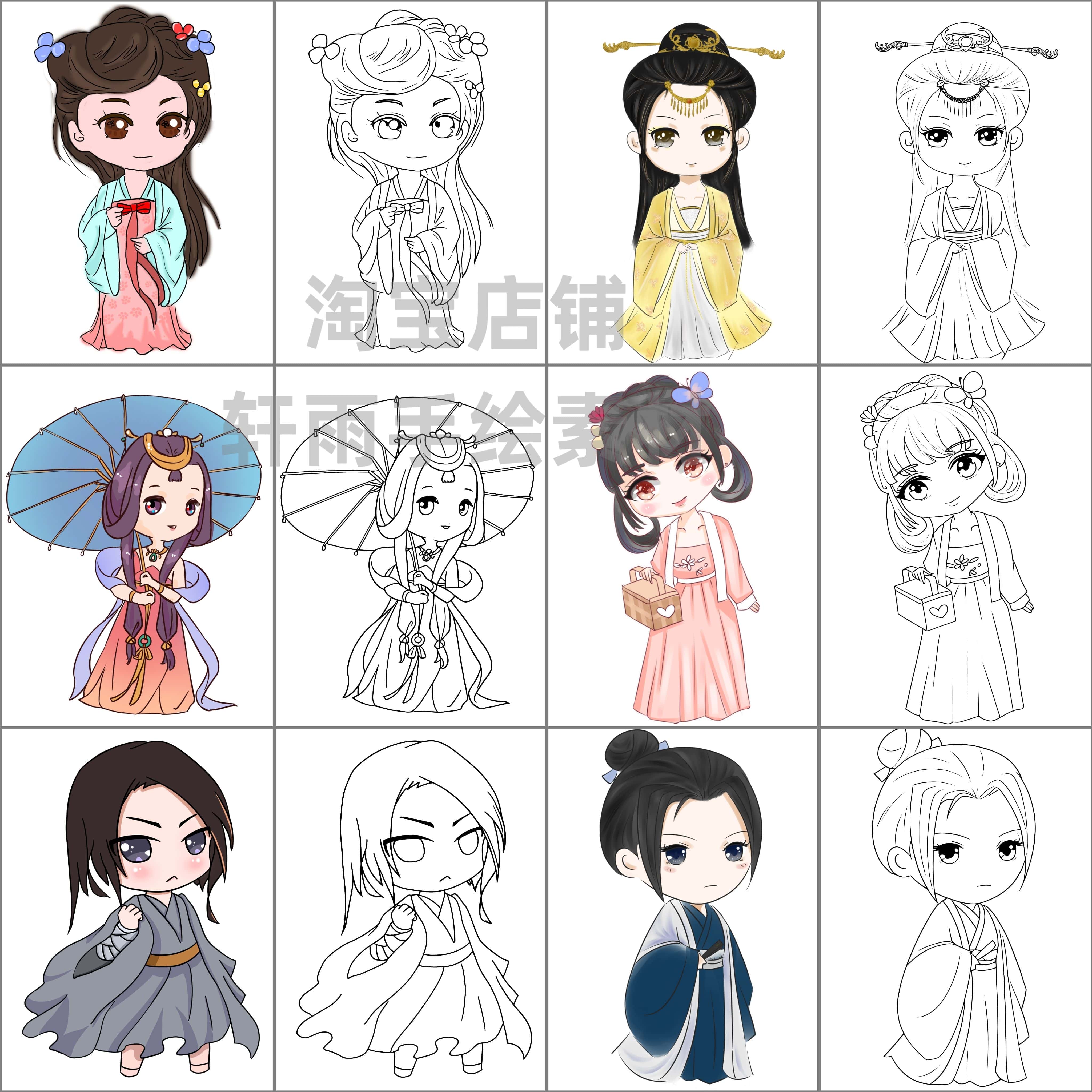 G590古装Q版汉服可爱人物黑白线稿JPG图打印涂色彩图参考电子绘画