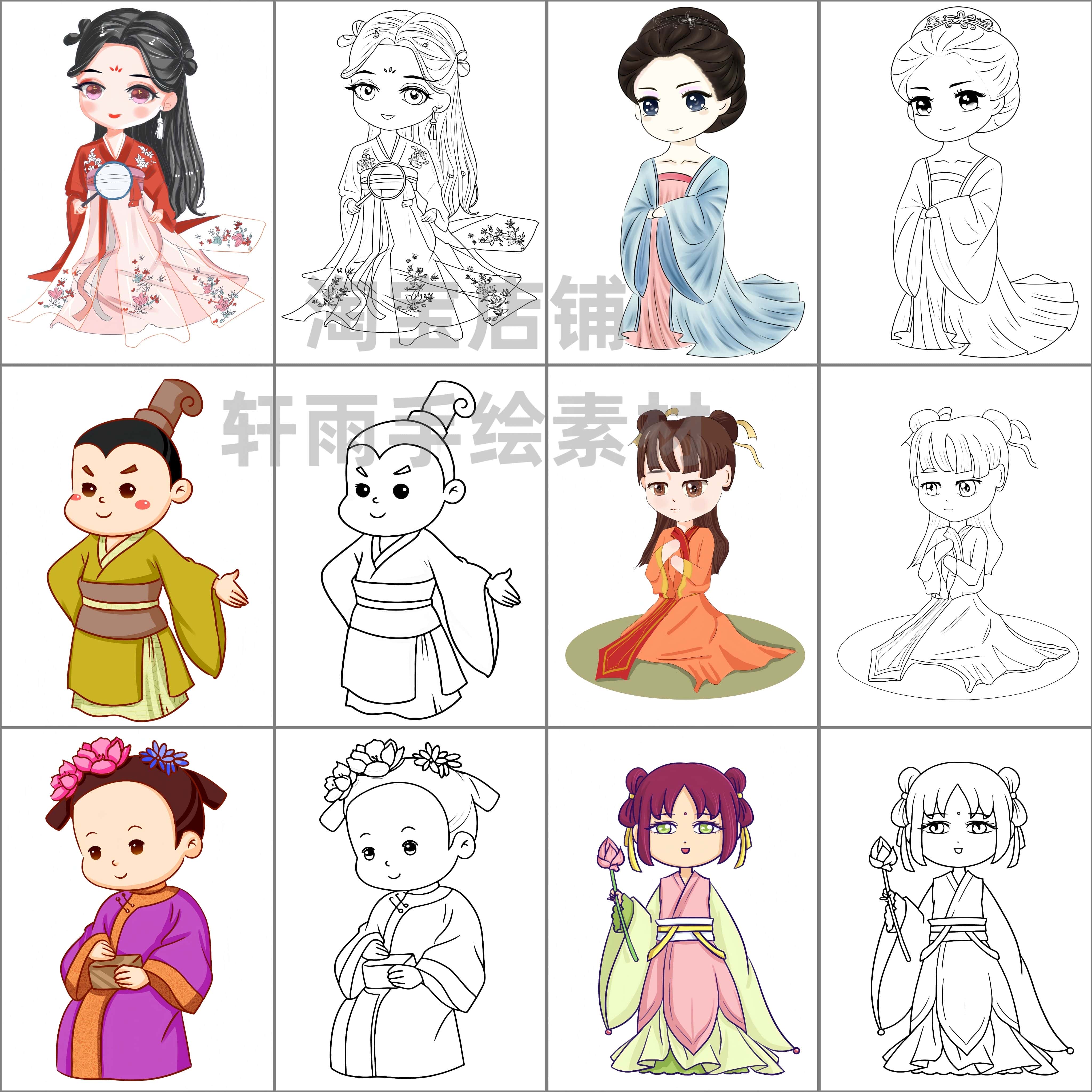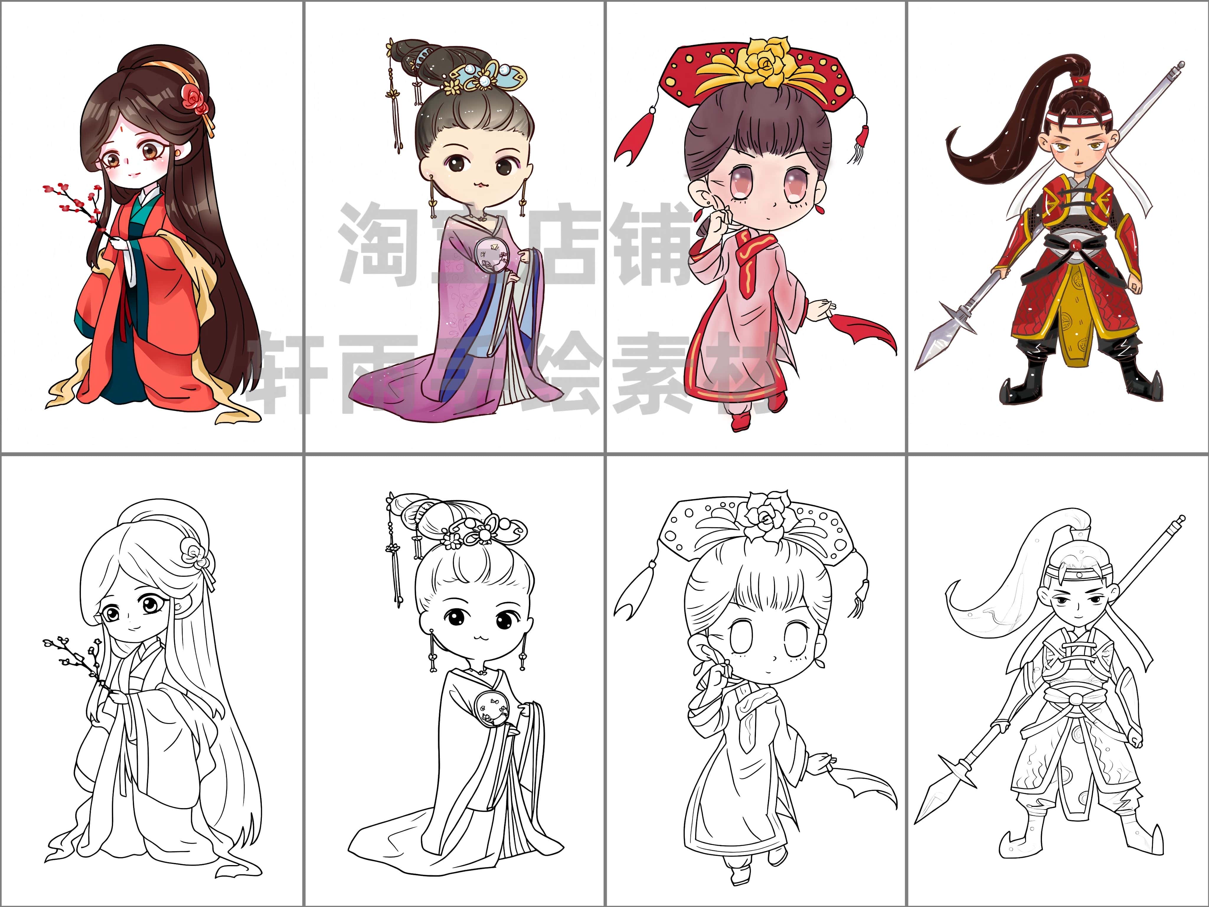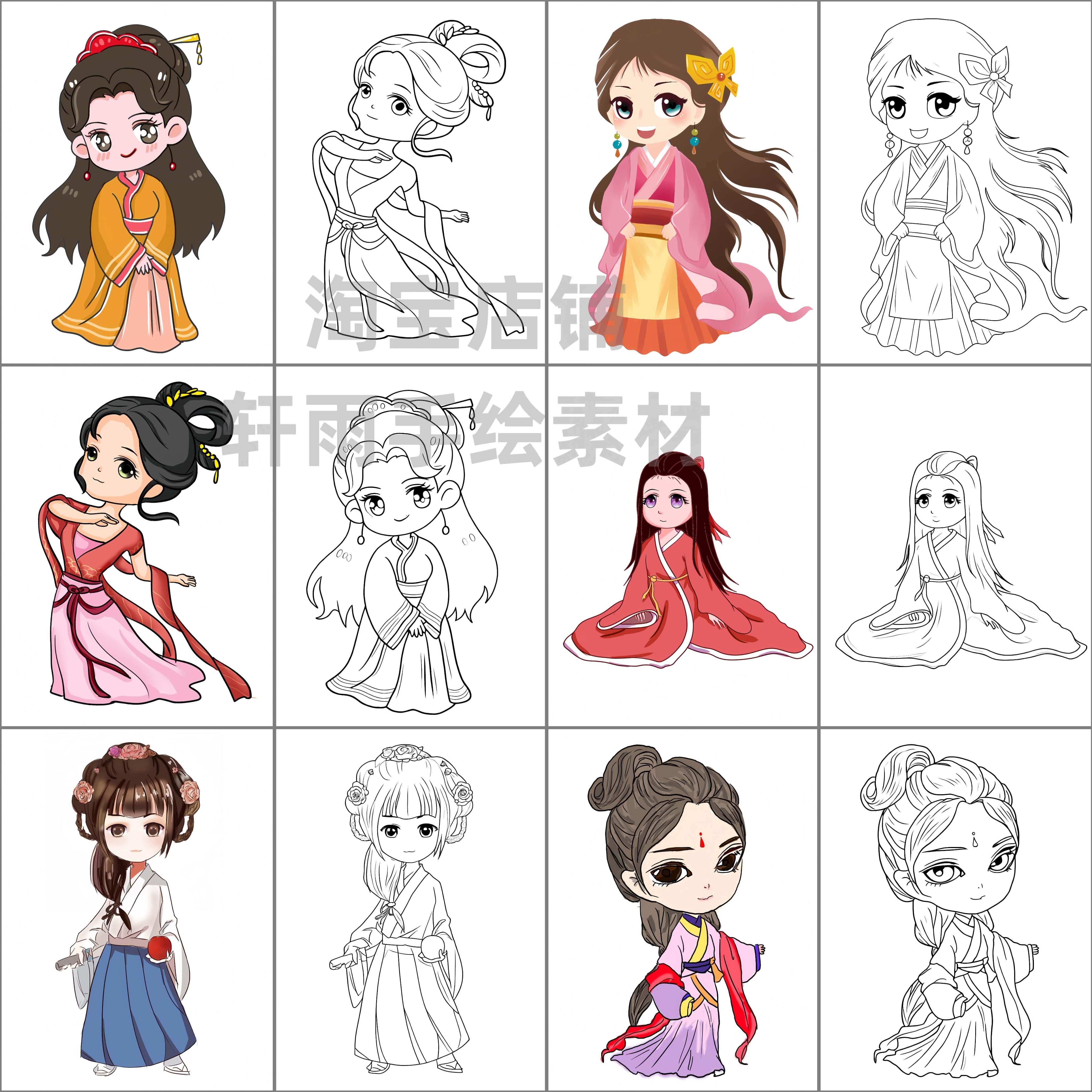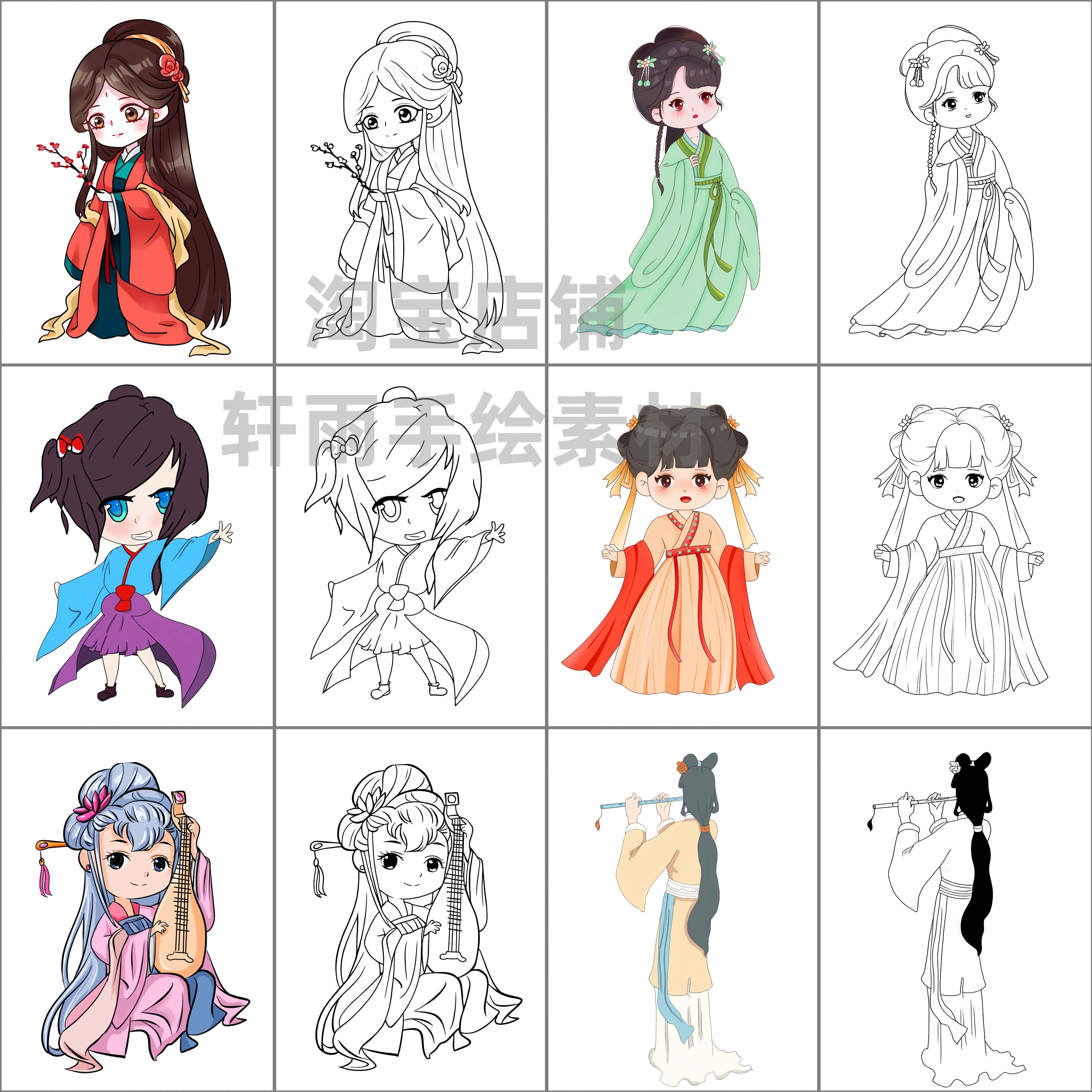 G590古装Q版汉服可爱人物黑白线稿JPG图打印涂色彩图参考电子绘画