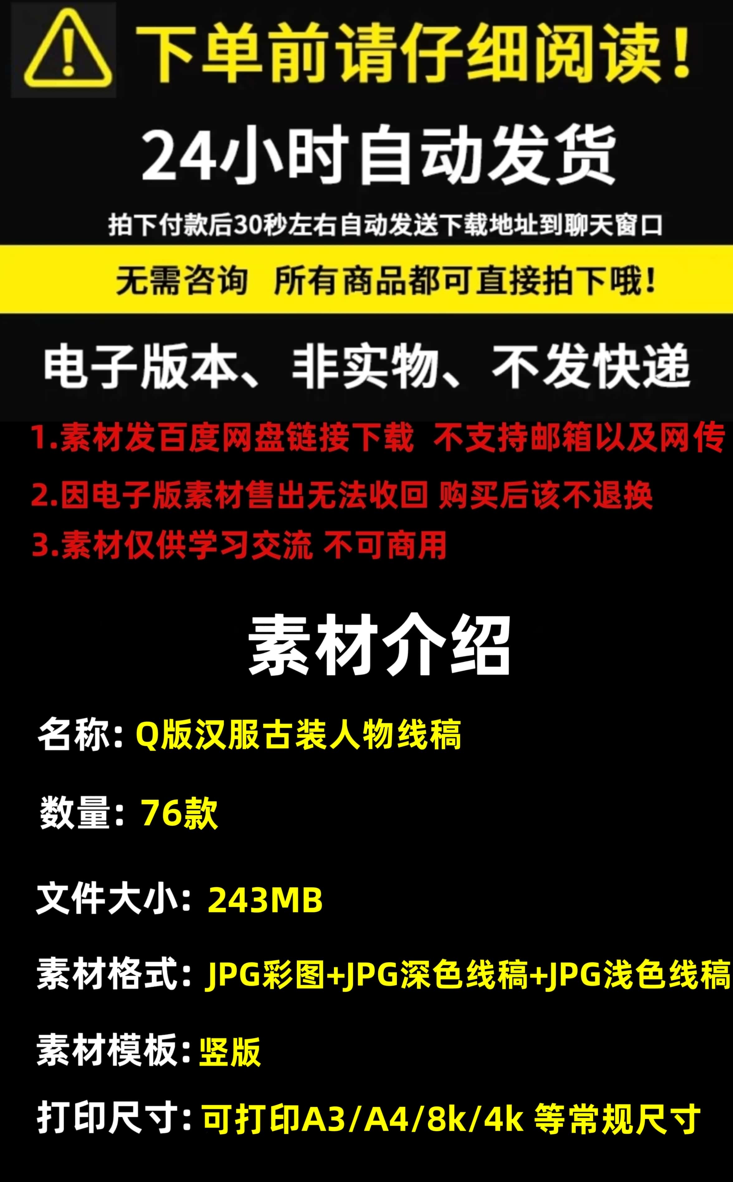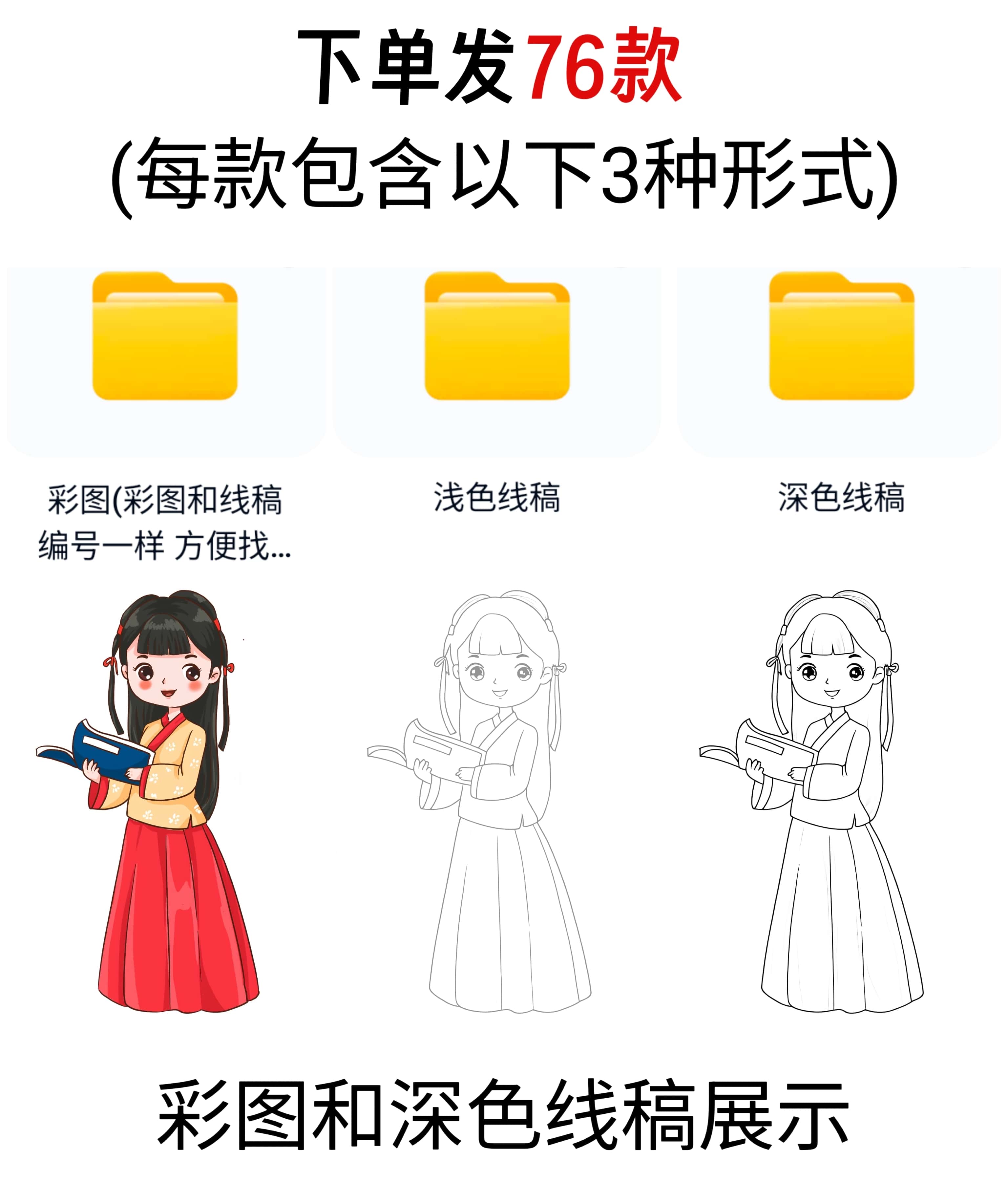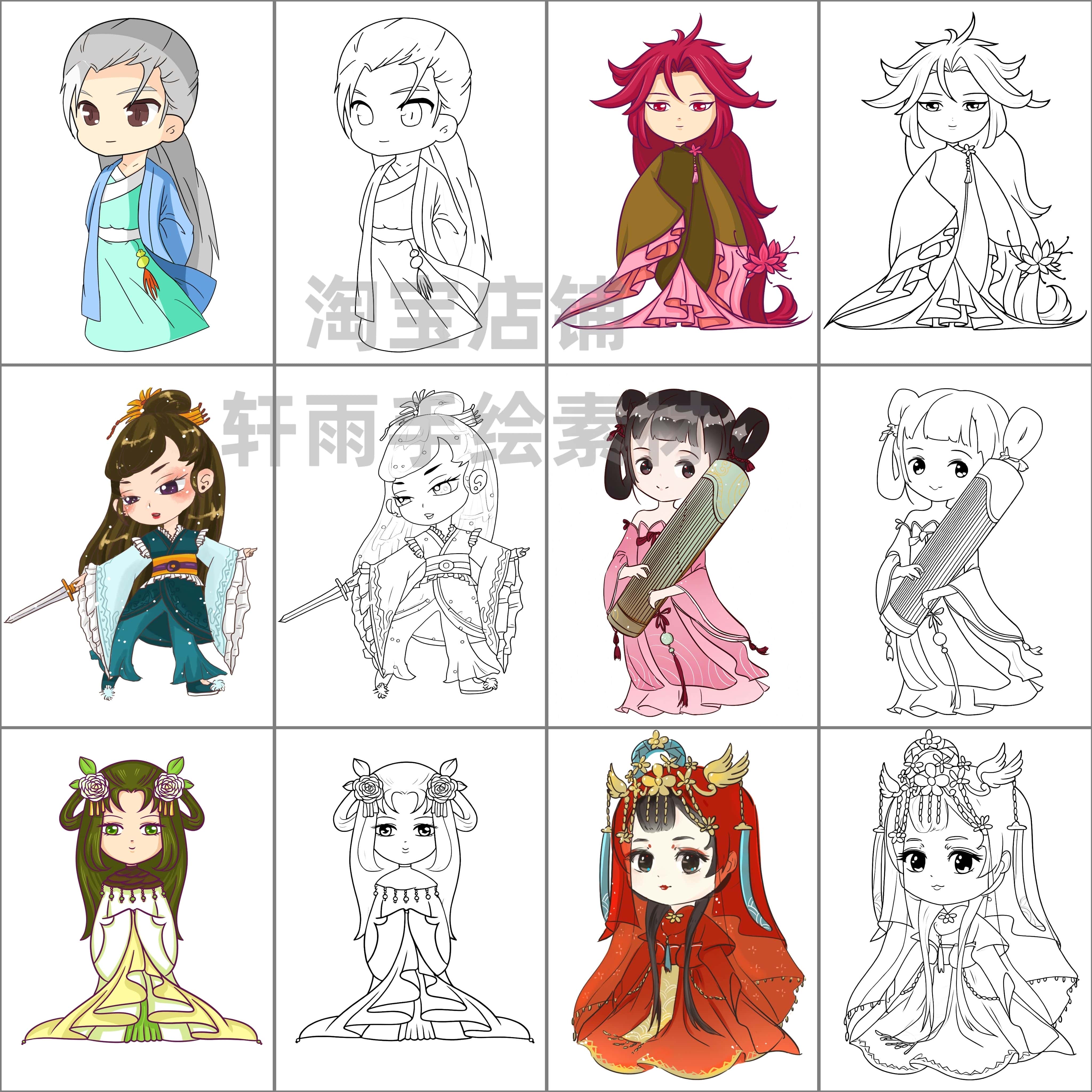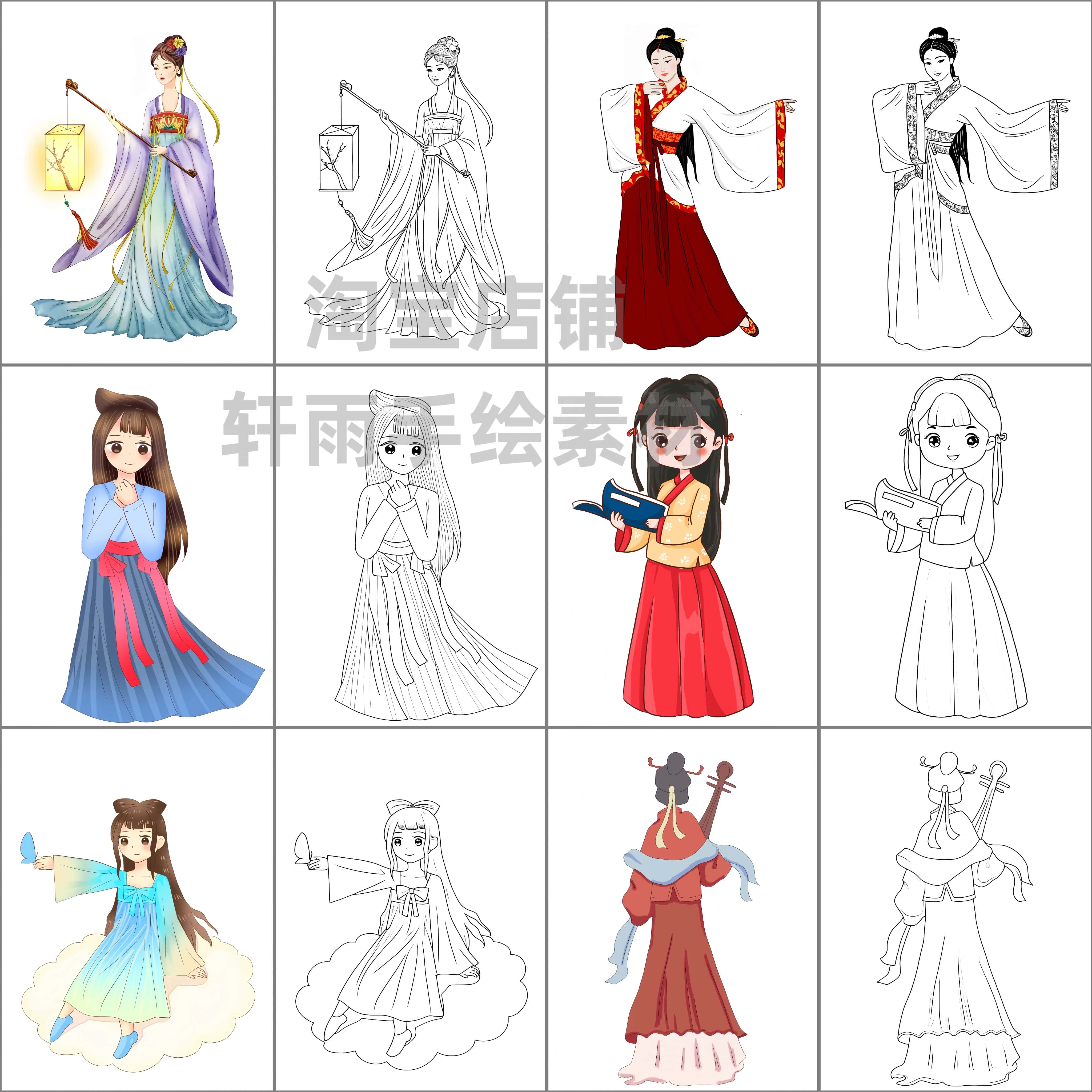 G590古装Q版汉服可爱人物黑白线稿JPG图打印涂色彩图参考电子绘画
