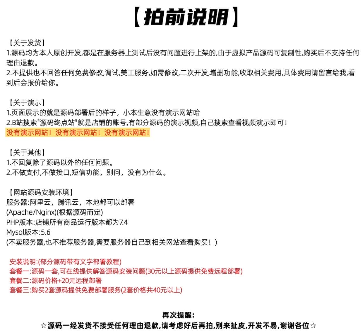 • 1、源码类:商品详情(含标题)与实际源码不一致的(例:描述PHP实际为ASP、描述的功能实际缺少、功能不能正常使用等)!有演示站时,与实际源码不一致的(但描述中有"不保证完全一样、可能有少许偏差"类似显著公告的除外);