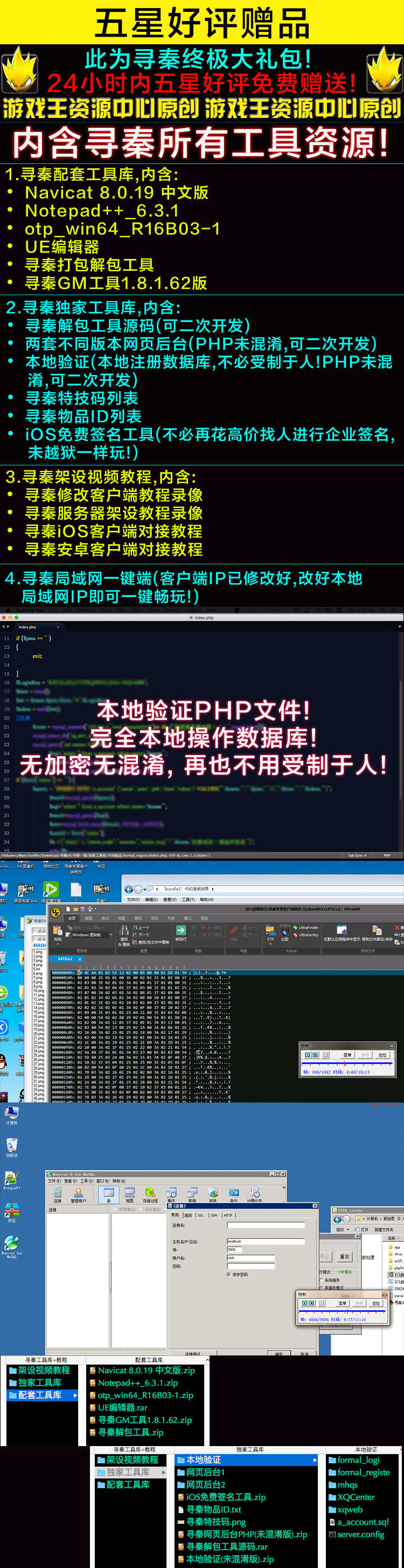 | 01 仔细挑选 严格检测 02 品质保证 放心使用 03 随时下载 灵活使用 04 增加内容 持续更新 . 寻秦所有工具资源 1. 含寻秦套件工具库, 含: * Navicat 8.019 中文版 . Notepad++ 6.3.1 37. opt_win64_R16B03-1 37. UE编辑器 2. 寻秦打包解包工具 3. 寻秦 GM工具1.8. 1. 62版 2. 寻秦独家工具库, 含: 1. 寻秦解包工具源玛 (可二次开发) 2. 套同套同版本网页后台(php/混清, 可二次开发) 3. 本地验证 (本地注册数据库, 不受拘束! php/混清, 可二次开发) 4. 寻秦技术列表 . 令表 i08免费签名工具 (不必再花高价找人进行企业签名, 妹越狱一样玩) 3. 寻秦教程, 含: 1. 寻秦修改客户端教程录像 2. 寻秦服务端建设教程 3. 游成. iOS 客户端对接教程 4. 寻秦版域网一键端 (客户端IP已修改好, 改好本地 . 款成功后 免费送此产品 极大礼包! 含寻秦现阶段所有工具及源码! 注意: 不懂相关技术人请自拍 语言或引撃: PHP 欢迎光临 亲 ![]() 点击联络我提货 |