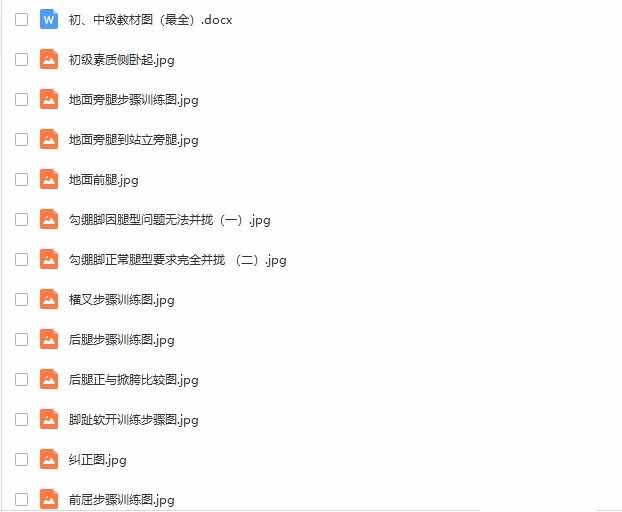 2019年升级的内容:【初级】 初级27个组合 初级技巧 初级素质 【中级】 (中级)肩、胸腰 (中级)素质 (中级)腿、胯 【技巧】 初级技巧(内含中级延伸技巧) 中高级技巧 【18版课程目录】 01《舞蹈(初级)基本功训练教程》(4-6岁) 02《舞蹈(中级)基本功训练教程》(7-8岁) 03《舞蹈(九大)基本功技巧分解》 04《舞蹈教学计划教案》 【课程训练目录】 01《舞蹈(初级)基本功训练教程》(4-6岁) (初级视频 配套音乐 素质训练 配套教案) 【初级上】 1坐姿 2压脚趾 3勾绷脚 4前压腿 5压跨 6颤肩、胸腰 7腰(一) 8腰(二) 9压后腿 10压前腿 11压旁腿 12跪立半腰 13站立半腰 【初级下】 1站姿 2压脚趾 3勾绷脚 4踮脚 5颤肩、胸腰 6跪下腰 7旁腿 8压后跨 9压腿 10地面前腿 11前旁大踢腿 12后踢腿 13扶把半腰 14站下腰 《初级基本功(素质)训练》 【背肌】 1背手起 2wlv抱头 3俯卧后抬腿 【腹肌】 1侧腹肌 2平地卷腹 3仰卧起坐(推手起) 4仰卧起坐(抱肩起) 5仰卧起坐(抱头起) 6仰卧起坐(沙袋辅助) 7仰卧起坐前抬腿 02《舞蹈(中级)基本功训练教程》(7-8岁) (中级视频 素质训练 配套教案) 【一、肩】 1耗正肩 2耗反肩 3甩肩、过肩 4 过肩分解 5跪地拉肩 【二、胸腰】 1跪地挑胸腰 2把上挑胸腰 3跪地挤胸腰 4控腰甩控腰甩腰弹腰 5俯卧后弯腰抱腿分解 6胸倒立接俯卧后弯腰抱腿 7板凳下腰 8扶把控腰抱腿 9中间控腰抱腿 10弹腰抱腿 11弹腰一次抱腿 12甩腰抱腿 【三、脚】 1踮脚(并脚踝) 压脚跟 2踮脚(并脚踝) 压脚跟(细节) 3踮脚走分解 4踮脚走 5压脚趾 单腿后踢 6压脚趾 单腿后踢(细节) 7脚背走 8勾绷脚 蹬膝盖 【四、后腿】 1压后胯(一阶段) 2压后胯(二阶段) 3盘腿竖叉后弯腰抱腿 4地面踢后腿 5地面踢抱后腿(加头) 6竖叉后弯腰抱腿 7俯卧抱后腿(单手) 8俯卧抱后腿(双手) 9地面踢抱后腿(不加头) 10把上踢后腿 11把上踢抱后腿(正扶) 12悠踢后腿接抱腿 13把上踢抱后腿(侧扶) 14中间踢后腿 15中间、板凳扳后腿 【五、前腿】 1前躯(2人) 2前躯(3人) 3地面前踢腿 4地面扳前腿 5把上压前腿 6墙上压前腿 7板凳压前腿 8把上踢前腿 9把上悠踢前腿接抱腿 10中间扳前腿 【六、旁腿】 1地面踢旁腿 2地面扳旁腿 3把上压旁腿(正面) 4墙上压旁腿 5板凳压旁腿 6把上踢旁腿 7把上悠踢旁腿接抱腿 8中间扳旁腿 【七、跨】 1两人组踩胯 2打胯(坐) 3打胯(俯卧) 4打胯(仰卧) 《中级基本功(素质)训练》 【一、背肌】 1背肌(wlv抱头) 2跷跷板前(抓肘) 3跷跷板前 4跷跷扳后(抓脚) 5跷跷板后 6跷跷板接胸倒立 7跷跷板接控制 【二、腹肌】 1仰卧起坐无辅助 2吸腿转腰 3仰卧起坐接转腿 4仰卧双前抱腿 5平地卷腹 6两头起 03《舞蹈(九大)基本功技巧分解》 【一下腰】 1跪下腰 分解1(高 板凳) 分解1(高 垫子) 分解2(中) 跪下腰 2站下腰 分解1(高 板凳) 分解1(高 垫子) 分解2(中) 站下腰 【二抢脸】 1 抢脸 串抢脸1分解 串抢脸2接跪 串抢脸3接站 抢脸接站 2 软扑虎 软扑虎 软扑虎慢动作 无支撑软扑虎 3 分解 分解1(摇摇船分段) 分解2(摇摇船) 分解3(摇摇船打凳子) 分解4(摇摇船打垫子) 分解5(摇摇船打地板) 分解6(重心练习) 【三胸倒立】 胸倒立 胸倒立(变形) 分解 分解1(两人) 分解2(上墙两人) 分解3(上墙) 【四肩倒立】 肩倒立 分解 分解1(把上) 分解2(中间) 【五后肩翻】 后肩翻(直腿起) 后肩翻(屈腿起) 分解 【六倒立】 靠墙直倒立 分解 分解1(踢后腿) 分解2(准备动作) 分解3(把上冲天炮分解) 分解4(把上冲天炮) 分解5(把上冲天炮加半脚尖) 分解6(中间冲天炮分解) 分解7(中间冲天炮) 分解8(把上顶肩) 分解9(把上顶肩分腿) 【七侧手翻】 1 侧手翻 2 串侧手翻 3 蹦跳侧手翻 4 趋步侧手翻 侧空翻(技巧) 1板凳侧手翻(高起) 2板凳侧手翻(低起) 3空翻 分解 分解1(倒立分单腿) 分解2(倒立分双腿侧落) 【八前桥 后桥】 1前桥 2后桥 3串前桥 4蹦跳前桥 5趋步前桥 6板凳前桥 前后桥分解 分解1(下腰控腿) 分解2(单腿半腰弹腰起) 分解3(单腿半腰) 分解4(单腿下腰) 分解5(单腿下腰抬腿起) 分解6(单腿下腰落踢起1) 分解6(单腿下腰落踢起2) 分解8(把上塌腰倒立) 分解9(塌腰倒立分腿) 分解10(留腿练习) 【九双飞燕】 双飞燕 分解 分解1 分解2 分解3 大绞柱 大绞柱 分解 分解1(单一绞柱) 分解2(俯卧倒踢) 分解3(胸倒立分腿) 分解4(变腰) 【小技巧】 挺身后抢脸 挺身后抢脸 分解 分解1(双人组脚背起) 分解2 分解3 肘撑前桥 肘撑前桥 肘撑倒立 肘撑侧手翻 侧肩倒立 软叠筋