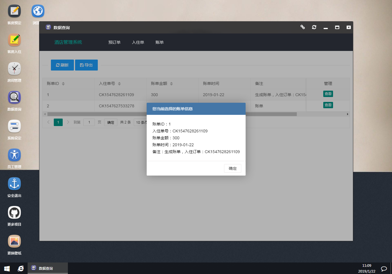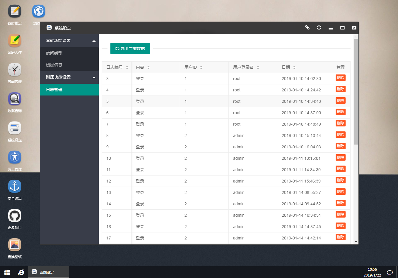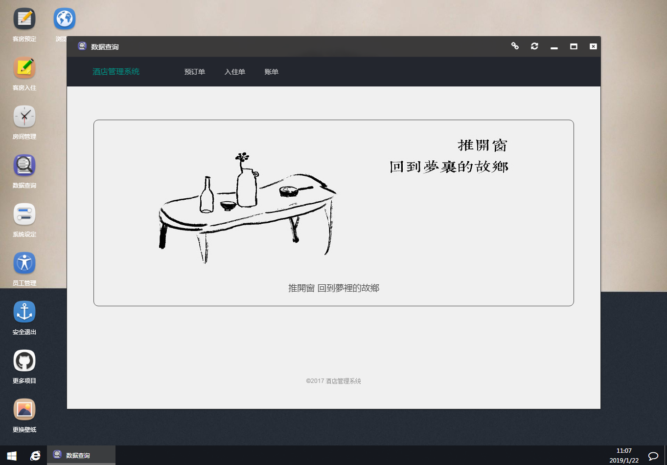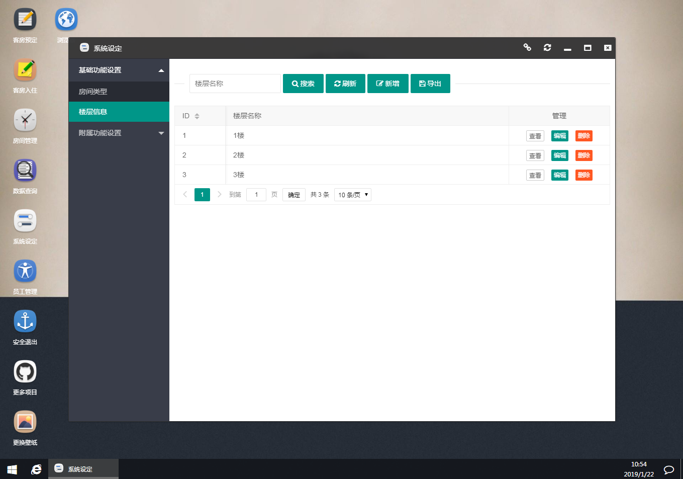 今天给大家演示的是一款由jsp servlet mysql实现的酒店管理系统,后端没有用到框架,用的是基础的servlet,前台用了一个仿win10的界面模板和layui前台框架,界面非常漂亮大气。主要实现的功能有:管理员登录、楼层管理、房型管理、房间管理、预约管理、入住管理、查看账单、日志管理、客户管理等,所有管理列表页面都提供了导出到excel的功能。此外还可以设置系统背景壁纸,非常方便。本项目资料目前包含有完整项目源码和视频导入运行教程,关于修改页面文字版权信息的视频里也会讲,视频教程可提前观看,地址是:https://pan.baidu.com/s/1iHP_yICfg6nMMU413oj-yg(因为百度云在线播放会压缩,导致不清晰,请下载后全屏观看,超清晰的)。