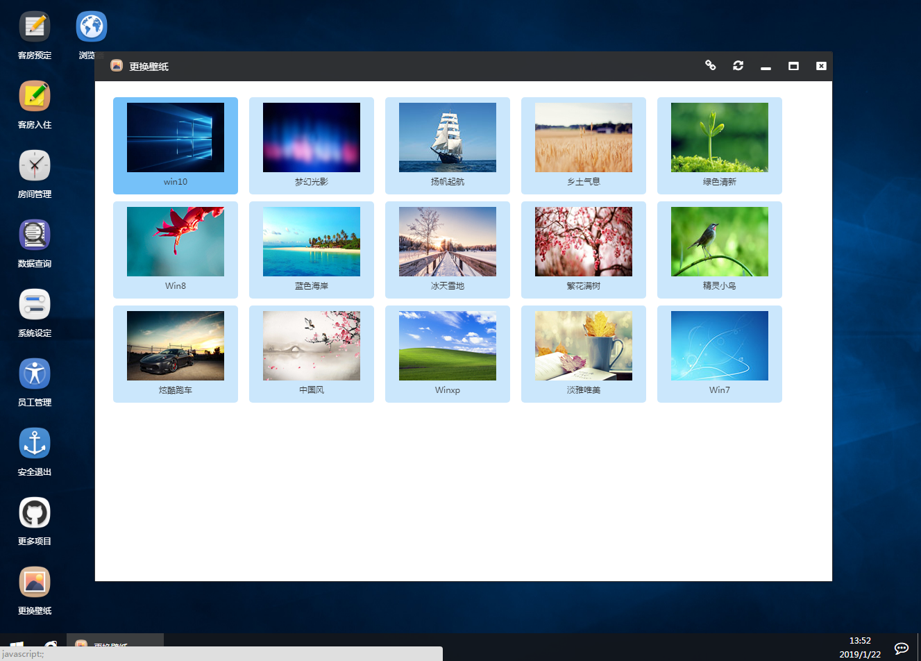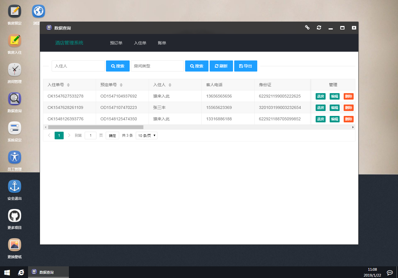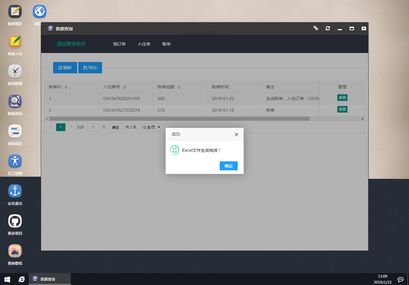 今天给大家演示的是一款由jsp servlet mysql实现的酒店管理系统,后端没有用到框架,用的是基础的servlet,前台用了一个仿win10的界面模板和layui前台框架,界面非常漂亮大气。主要实现的功能有:管理员登录、楼层管理、房型管理、房间管理、预约管理、入住管理、查看账单、日志管理、客户管理等,所有管理列表页面都提供了导出到excel的功能。此外还可以设置系统背景壁纸,非常方便。本项目资料目前包含有完整项目源码和视频导入运行教程,关于修改页面文字版权信息的视频里也会讲,视频教程可提前观看,地址是:https://pan.baidu.com/s/1iHP_yICfg6nMMU413oj-yg(因为百度云在线播放会压缩,导致不清晰,请下载后全屏观看,超清晰的)。