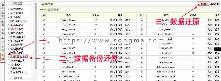 3、安装之后登陆后端.选择到 "系统- 系统设置 - 数据库备份/复原 - 复原数据库  "点击提交! (注意:复原数据库在右上角.直接点击之后是先进去备份数据库了,要先点击复原数据库才可以复原)