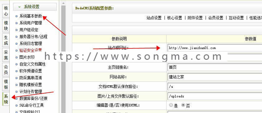 4、设置下基本参数:系统》基本参考设置》站点根网址 请写上你的域名带http://(如下图所示,本地测试请写本服务器地址)