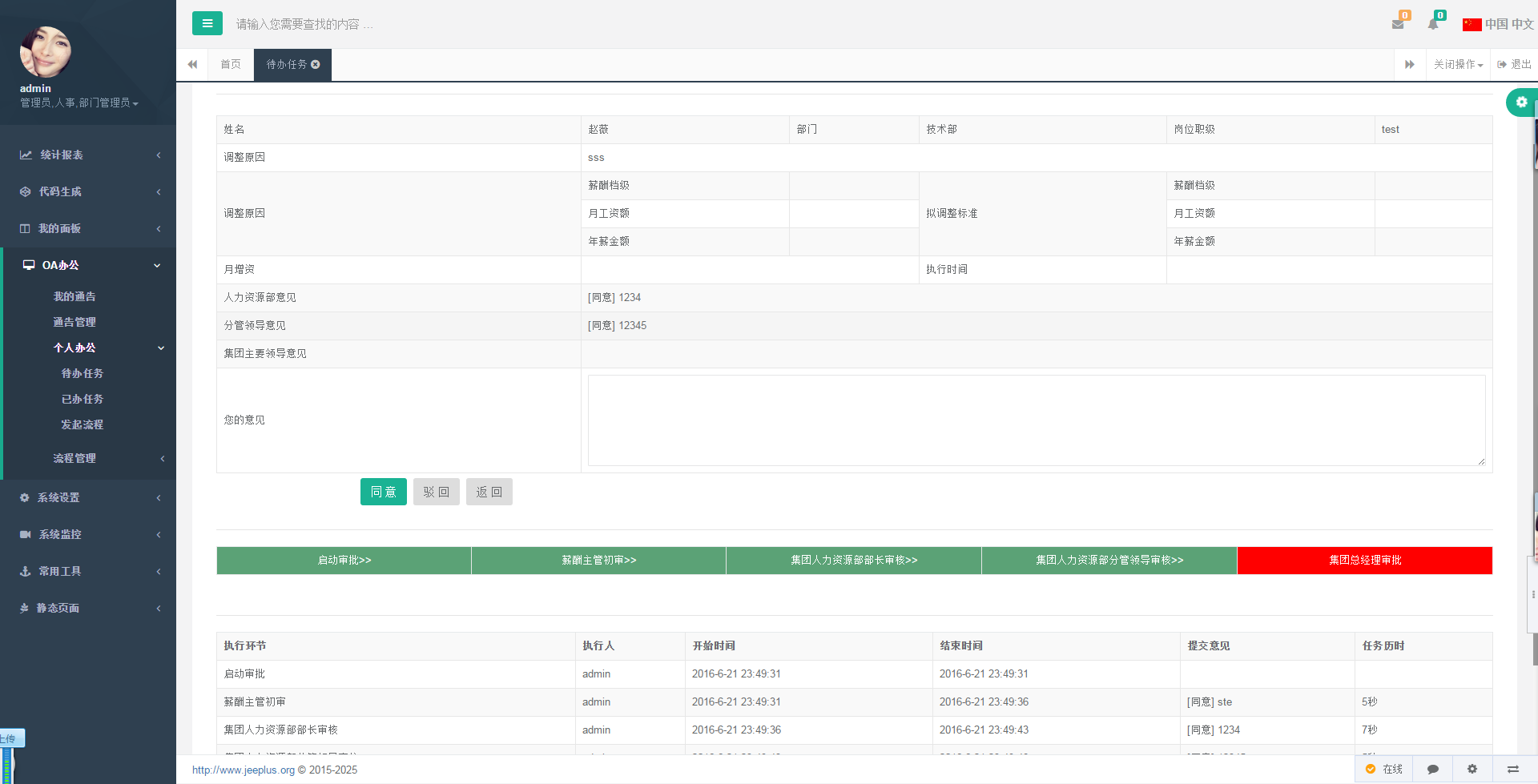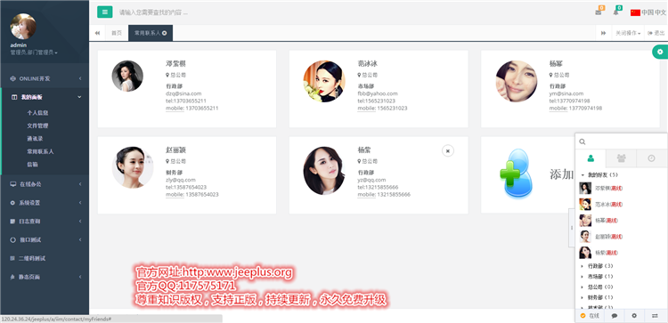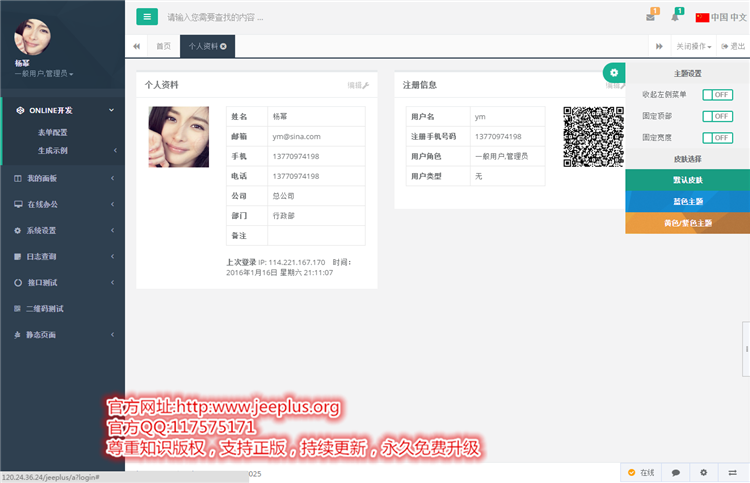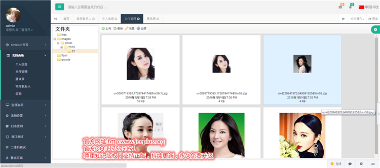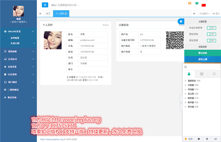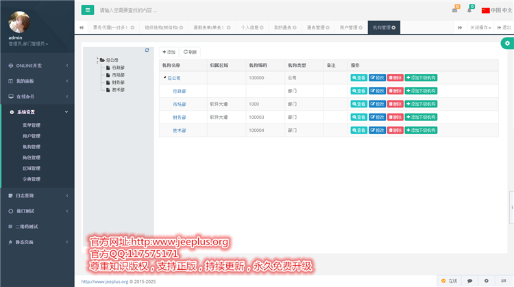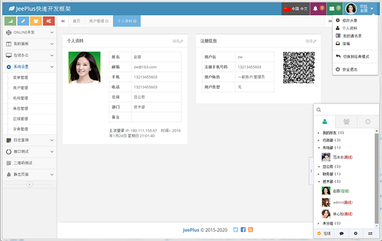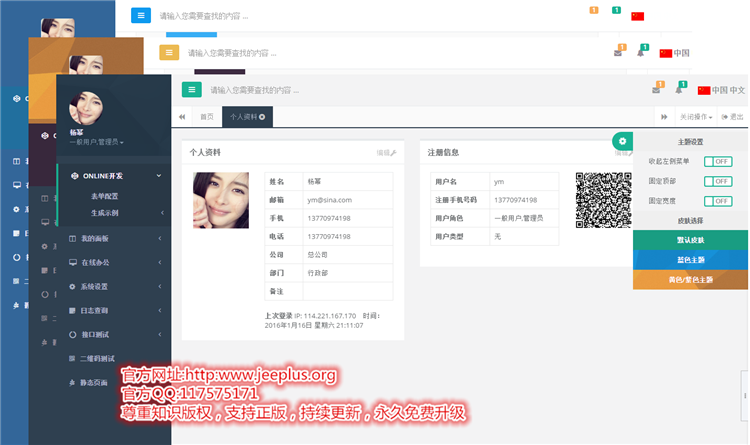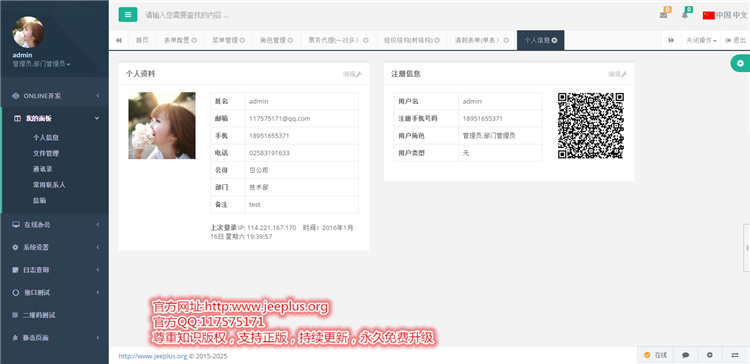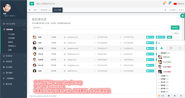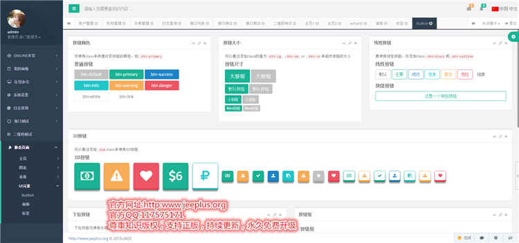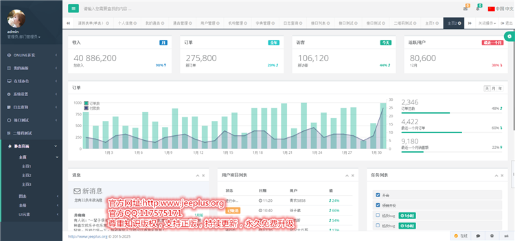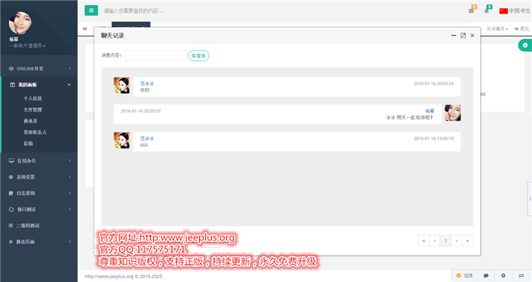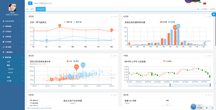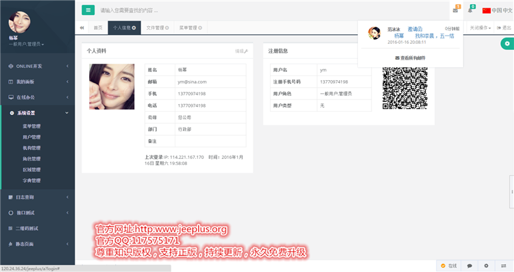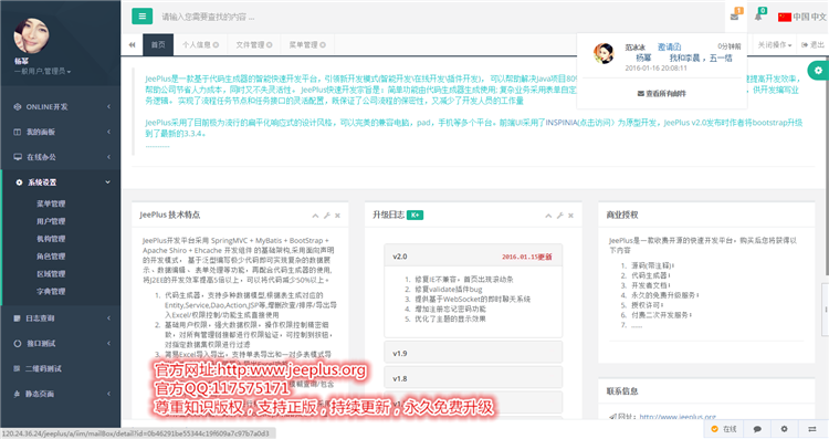代码生成器,支持多种数据模型,根据表生成对应的Entity,Service,Dao,Action,JSP等,增删改查/排序/导出导入Excel/权限控制/功能生成直接使用 基础客户权限,强大数据权限,操作权限控制精密细致,对所有管理链接都进行权限验证,可控制到按钮,对指定数据集权限进行过滤 Excel导入导出,支持单表导出和一对多表模式导出,生成的代码自带导入导出Excel功能 查询过滤器,查询功能自动生成,后端动态拼SQL追加查询条件;支持多种匹配方式(全匹配/模糊查询/包含查询/不匹配查询) UI标签库,针对WEB UI进行标准封装,页面统一采用UI标签实现功能:封装了bootstrap风格的table,检索,部门选择 ,人员选择等常用控件。 国际化,支持多语言,多语言系统切换(测试中,即将发布) 集成百度Echarts,实现曲线图,柱状图,数据等报表 系统日志监控,详细记录操作日志,可支持追查表修改日志 WebSocket集成:集成在线聊天系统。 提供常用工具类封装,日志、缓存、验证、字典、组织机构等,常用标签(taglib),获取当前组织机构、字典等数据。 连接池监视:监视当期系统数据库连接池状态,可进行分析SQL找出系统性能瓶颈。 提供APP接口,可以快速和移动APP整合。 支持多种浏览器: IE, 火狐, Google 等浏览器访问速度都很快 支持数据库: Mysql,Oracle数据库的支持,但不限于数据库,平台留有其它数据库支持接口等