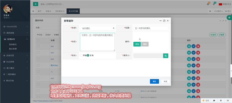 发布通知 ,可以发布一个系统通知,同样客户可以在上方小铃铛处收到通知信息。