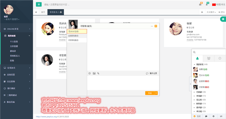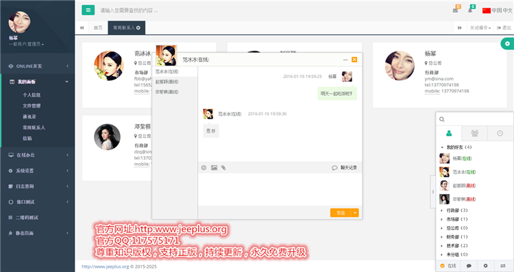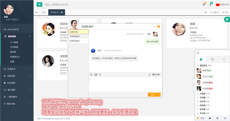 即时聊天,支持同时和多个客户聊天,有新消息,自动弹出对话框,并高亮显示状态栏,支持发送离线消息,有聊天记录功能。